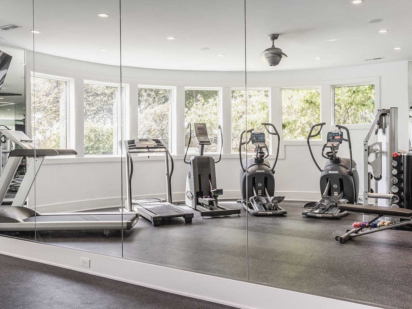 A bright and spacious home gym featuring a wall of floor-to-ceiling mirrors highlights an array of state-of-the-art cardio equipment, including treadmills and elliptical trainers. The room is filled with natural light from a curved row of broad windows, creating a refreshing atmosphere surrounded by greenery. Neutral white walls and ceiling keep the space clean and modern, while rubberized black flooring ensures safety and comfort for family members of all ages. Ample room between machines and extra dumbbells accommodate both solo and group workouts, making this gym ideal for health-focused families.