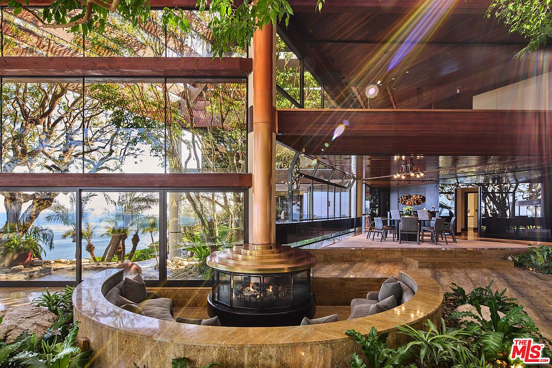 A stunning sunken lounge centers around a modern, circular fireplace, surrounded by plush curved seating that’s perfect for family gatherings or entertaining friends. Floor-to-ceiling glass walls flood the space with natural light and reveal sweeping views of the lush landscape and ocean beyond, creating a seamless indoor-outdoor connection. Rich wooden ceilings and trim, paired with neutral stone steps and leafy indoor plants, give the area a warm, organic feel while maintaining a sophisticated edge. The adjacent open dining area ensures easy flow and flexibility, ideal for both quiet evenings and lively social occasions.
