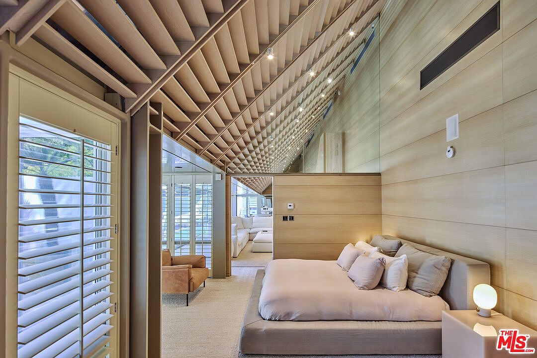 This spacious master bedroom features a striking vaulted ceiling with exposed beams and dramatic angles, creating a sense of openness and modern sophistication. Warm wood paneling and soft neutral tones throughout the room foster a calming, inviting atmosphere ideal for relaxation. The plush, low-profile bed with an assortment of pillows promises comfort, while the bedside lamp adds a cozy touch. A private reading nook complete with a light tan armchair is perfect for unwinding. Floor-to-ceiling windows with plantation shutters allow natural light to filter in, ensuring privacy and a family-friendly space that feels both secure and serene.