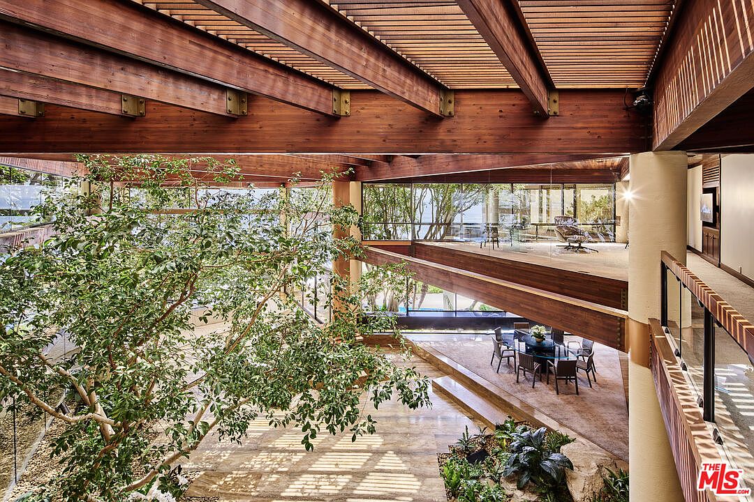 A stunning two-level atrium seamlessly merges indoor and outdoor living, with expansive glass walls that flood the area with natural light. Mature indoor trees and lush greenery create a serene, nature-inspired setting, while the exposed wooden beams and natural stone floors evoke warmth and sophistication. The lower level features a modern dining area, perfect for family meals or entertaining, surrounded by garden beds and open sightlines. Upstairs, lounge seating offers a cozy retreat with views of the verdant interior landscape, making this space both welcoming and family-friendly. The neutral palette enhances the natural elegance throughout.