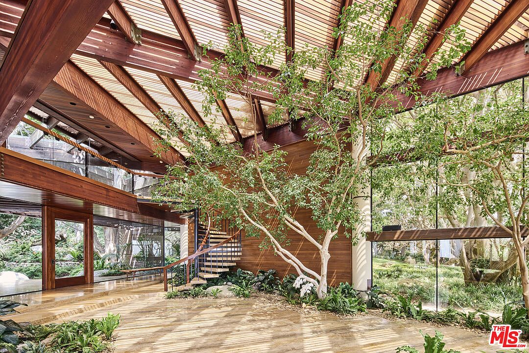 A breathtaking atrium welcomes you with soaring ceilings, vast glass walls, and a curated indoor garden featuring mature trees that blend seamlessly with the home’s natural surroundings. The open-concept layout invites effortless movement between lounging and entertaining areas, making it ideal for families and guests alike. Warm wood paneling, exposed beams, and polished stone floors contribute to a serene and inviting aesthetic, while abundant sunlight streams through the slatted ceiling to create playful patterns. The greenery softens the architecture and creates a relaxing oasis, making this space perfect for children to explore or adults to unwind with nature-inspired tranquility.