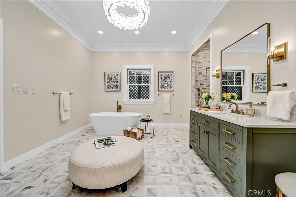 This spacious bathroom combines elegance and functionality with its open layout. A freestanding soaking tub becomes a focal point, encouraging relaxation. The serene color scheme features soft beige walls, complemented by a mosaic tile floor that adds texture and warmth. Ample natural light shines through window treatments, enhancing the airy feel. The double vanity boasts a rich green cabinetry, harmonizing beautifully with the marble countertop, while stylish gold accents on fixtures add a touch of sophistication. Thoughtful design elements, like framed artwork and plush furnishings, create an inviting atmosphere perfect for family use or personal retreats.