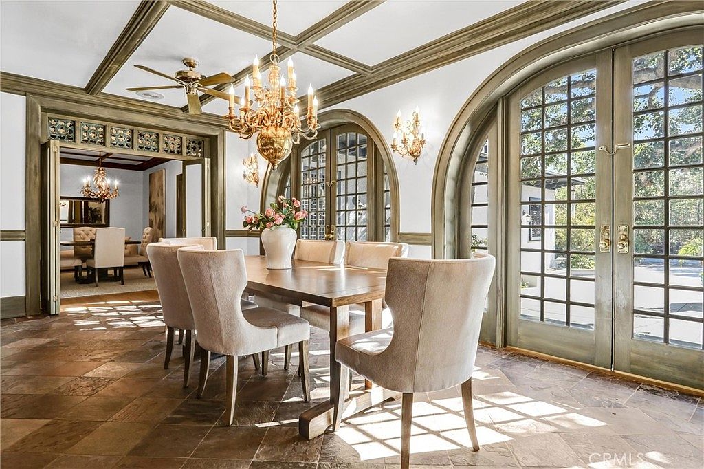 This stunning dining room exudes sophistication with its elegantly designed coffered ceiling and warm, earthy tones. The spacious layout features a large wooden table surrounded by plush, cream-colored chairs, perfect for family gatherings. A striking chandelier illuminates the space, complemented by tasteful wall sconces that provide a soft glow. Arched, double-pane glass doors offer an inviting view of the outdoors, seamlessly blending indoor and outdoor aesthetics. The natural stone flooring adds a touch of rustic charm, while decorative wood accents frame the room, enhancing the character. This setting fosters a sense of warmth and togetherness.