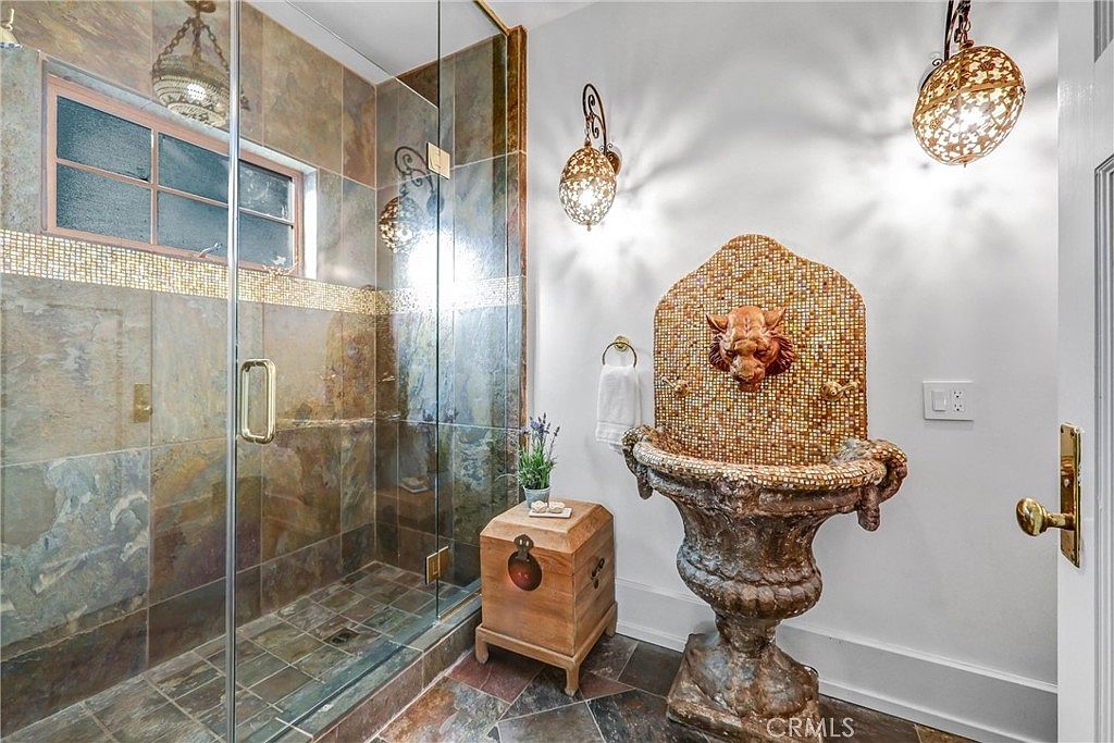 A stunning bathroom features a spacious glass-enclosed shower, intricately designed with natural stone tiles that create a serene atmosphere. The decorative lion fountain, adorned with mosaic tiles, serves as a striking focal point, enhancing the room’s elegance. Stylish hanging light fixtures provide warm illumination, accentuating the textures of the stone walls. The color palette combines earthy tones with hints of gold accents, promoting a calming ambiance. A small wooden side table adds functionality, perfect for storing toiletries, while the towel holder complements the sophisticated decor. This luxurious space offers both style and comfort, ideal for family relaxation.