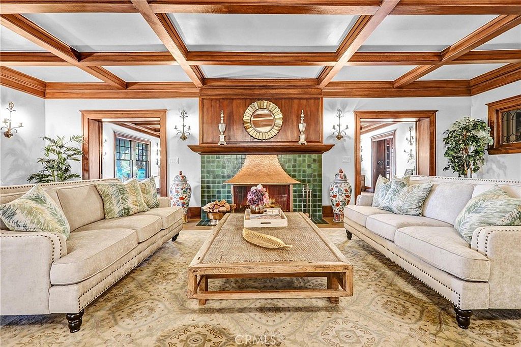 The charming living room features a harmonious blend of traditional design and modern comforts. A coffered wooden ceiling enhances the spaciousness, while elegant sconces flank a detailed fireplace adorned with green tiles. Sophisticated beige sofas, accented by lush throw pillows, invite relaxation and conversation. The natural wood tones of the furniture and architectural details create a warm, welcoming atmosphere. A rustic coffee table stands center stage, showcasing tasteful décor, adding to the family-friendly vibe. Lush greenery punctuates the space, softening the corners and enhancing the cozy, intimate feel, perfect for gatherings or quiet evenings at home.