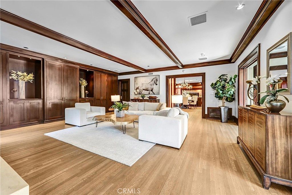 A spacious living room exuding sophistication, highlighted by rich walnut paneling and elegant coffered ceilings. Soft white sofas provide a striking contrast against the warm wood tones, creating an inviting atmosphere. The carefully arranged coffee table adds a touch of modern simplicity, while a plush area rug anchors the space. Decorative plants and tasteful artwork enhance the family-friendly design, allowing for both relaxation and social gatherings. Natural light floods in, illuminating the subtle color palette of cream and brown, making this room not only a focal point in the home but also a cozy retreat for families.