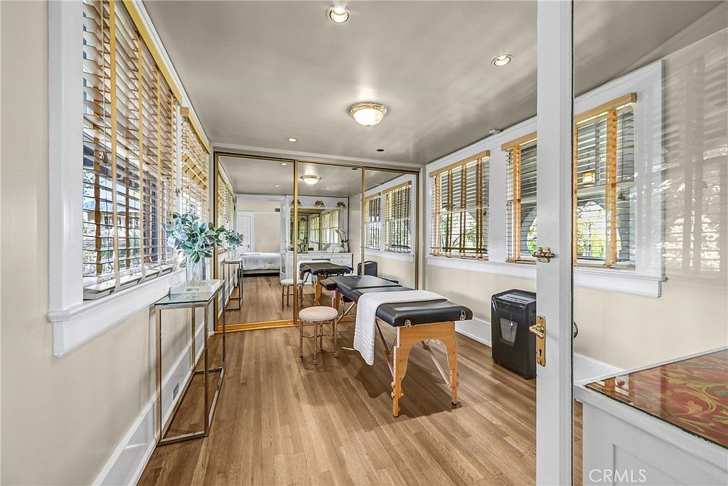 This inviting sunroom offers a serene retreat, perfect for relaxation and informal gatherings. Natural light pours in through ample windows adorned with elegant blinds, illuminating the warm wooden flooring. Featuring comfortable treatment tables, it can serve as a spa-inspired space or leisure area. A sleek glass table adds a modern touch, ideal for displaying greenery or drinks. The neutral color palette incorporates soft beige walls with white trim, enhancing the airy feeling. Architectural details, such as the decorative ceiling light and clean lines, create a harmonious and inviting atmosphere, making it a perfect family-friendly oasis.
