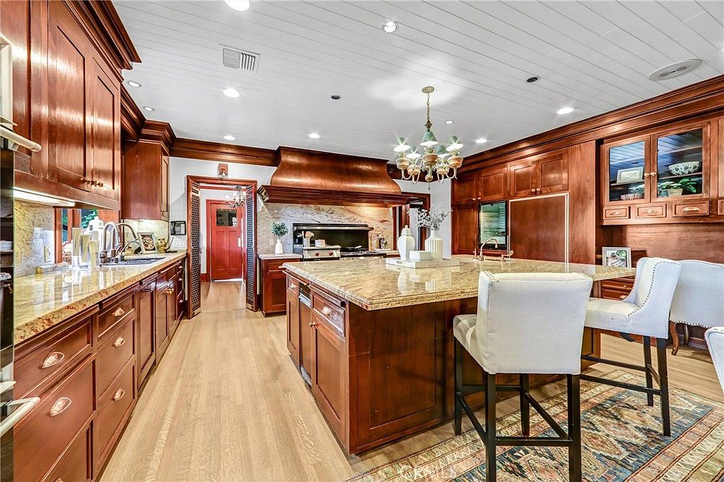 This stunning kitchen showcases a perfect blend of functionality and aesthetic appeal. Rich mahogany cabinetry and a gleaming granite island create a warm, inviting atmosphere ideal for family gatherings. The open layout encourages interaction, with ample counter space for meal prepping. Modern appliances are seamlessly integrated, while the decorative chandelier adds a touch of elegance. Soft, neutral tones harmonize with the hardwood flooring, enhancing the spacious feel. A cozy seating area at the island offers a comfortable spot for casual dining. Thoughtful design elements and classic finishes make this kitchen a heartwarming focal point of the home.