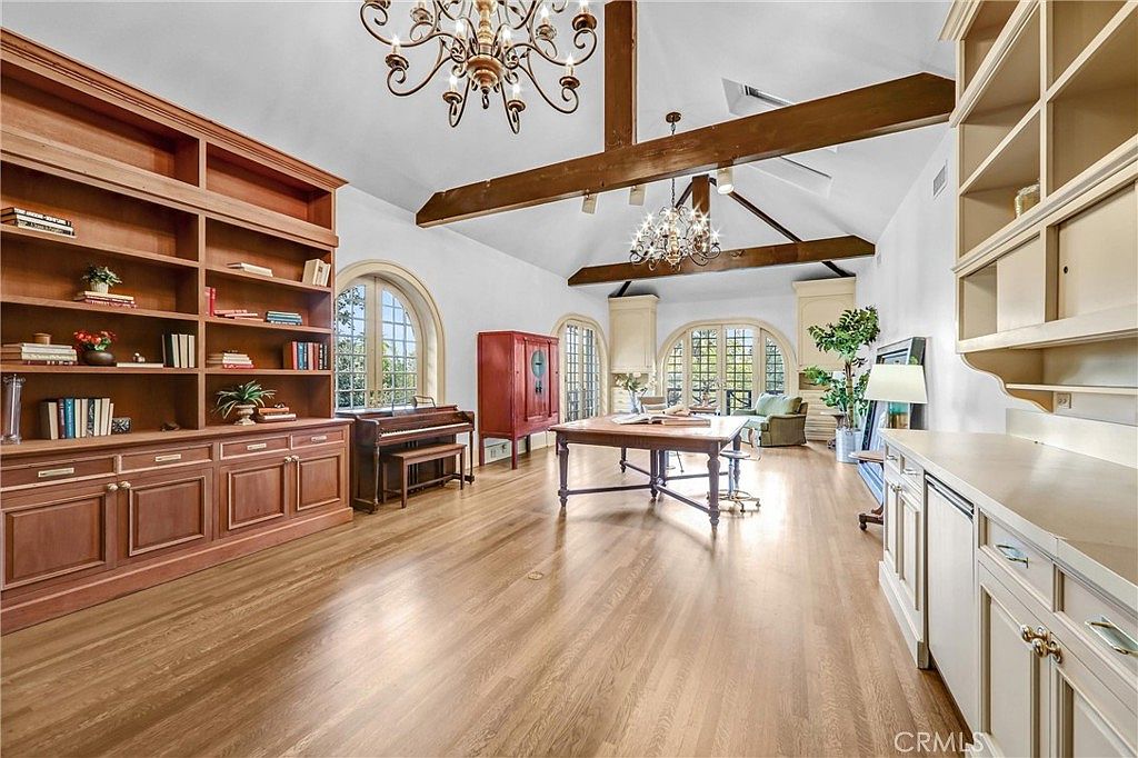 Featuring vaulted ceilings with exposed beams, this spacious family room exudes elegance and warmth. A grand chandelier adds a touch of sophistication, illuminating the warm wooden floors. The built-in bookshelves, adorned with personal touches, invite cozy reading moments. A prominent dining table provides a central gathering space for family activities, complemented by a soft, inviting sofa nestled against an arched window that frames serene outdoor views. The soft color palette of whites and light pastels enhances the airy feel, while decorative accents create a perfect blend of modern style and timeless charm, ideal for family bonding.