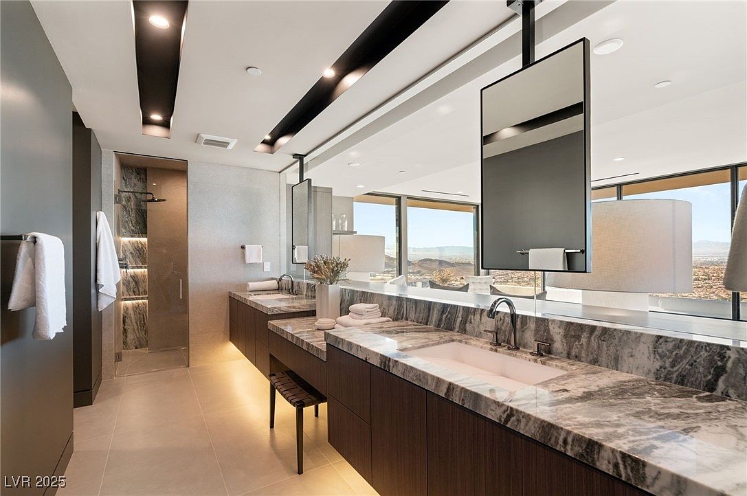 Sleek lines and contemporary finishes define this spacious bathroom, featuring an expansive marble-topped double vanity ideal for family use. Large windows flood the room with natural light while offering panoramic views, enhancing an open, calming ambiance. Dramatic black and white accented lighting fixtures on the ceiling, paired with suspended mirrors, emphasize modern sophistication. Ample storage draws are seamlessly integrated into the wood cabinetry, maintaining a clutter-free environment. The glass-enclosed walk-in shower adds a luxurious touch and ensures accessibility for all ages. Neutral tile flooring and subtle décor complete a harmonious, family-friendly space perfect for both relaxation and routine.