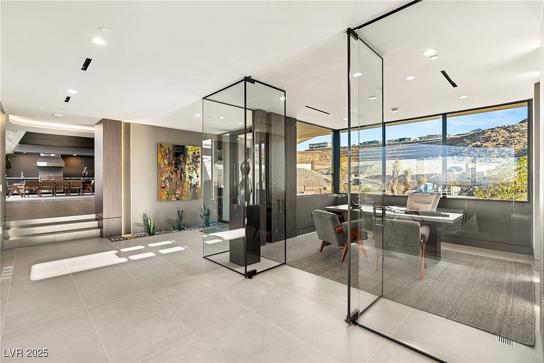 A striking home office enclosed by floor-to-ceiling glass walls creates a seamless flow between work and living spaces. The minimalist aesthetic is enhanced by soft gray tile flooring, clean lines, and an abundance of natural light from expansive windows that offer panoramic views of the outdoors. Sleek, modern furniture includes plush gray chairs and a substantial desk, making it ideal for productivity while remaining welcoming for family collaboration. Art pieces and subtle greenery add warmth without overpowering the serene, neutral palette. The open layout supports both focus and connectivity, with easy transition to adjoining living and dining areas just steps away.