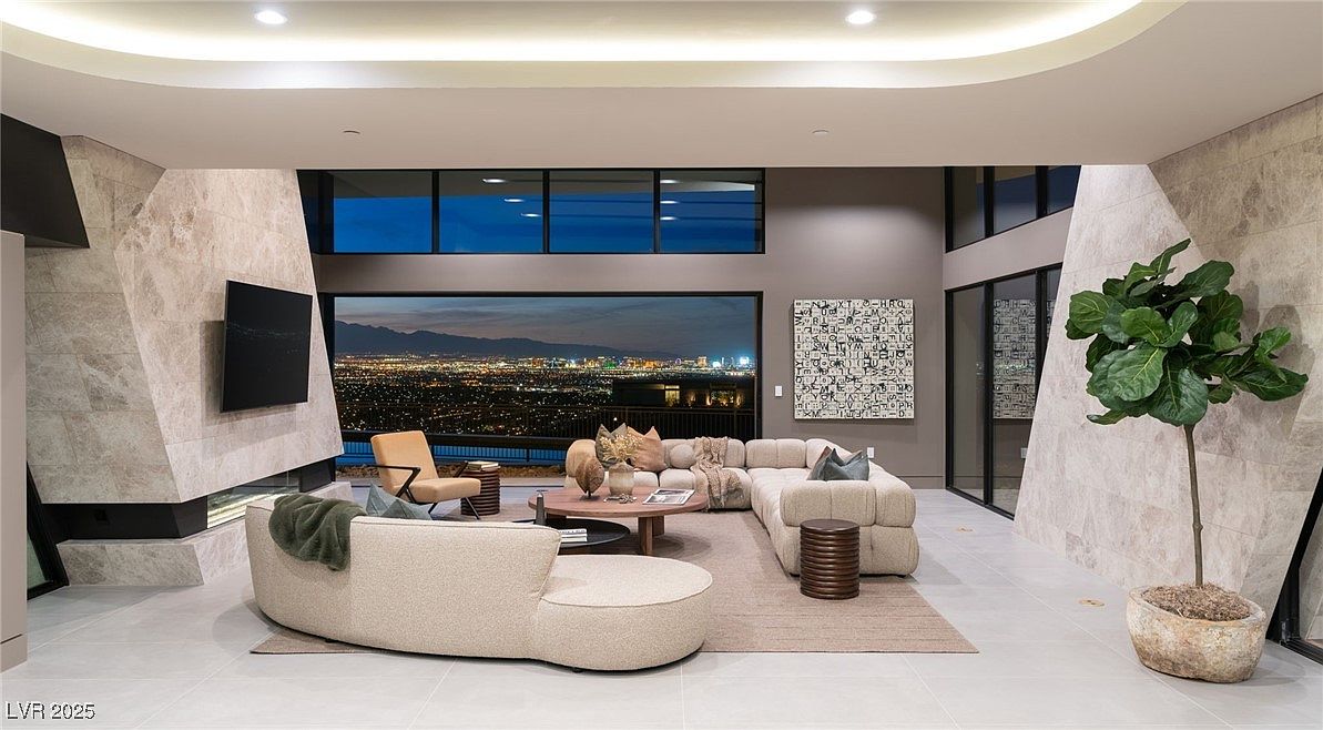 A grand open-concept living room features floor-to-ceiling windows offering sweeping views of a sparkling city skyline and distant mountains. Contemporary architecture is highlighted by geometric stone walls and a dramatic recessed ceiling, creating a sophisticated atmosphere. Plush, cream-colored sectional sofas are arranged around a low coffee table on a natural-toned rug, providing a comfortable and inviting space for families to gather. A large fig plant and modern wall art add warmth and personality. Neutral tones, soft seating, ample floor space, and integrated media accents make this room stylish and functional for everyday living and entertaining.