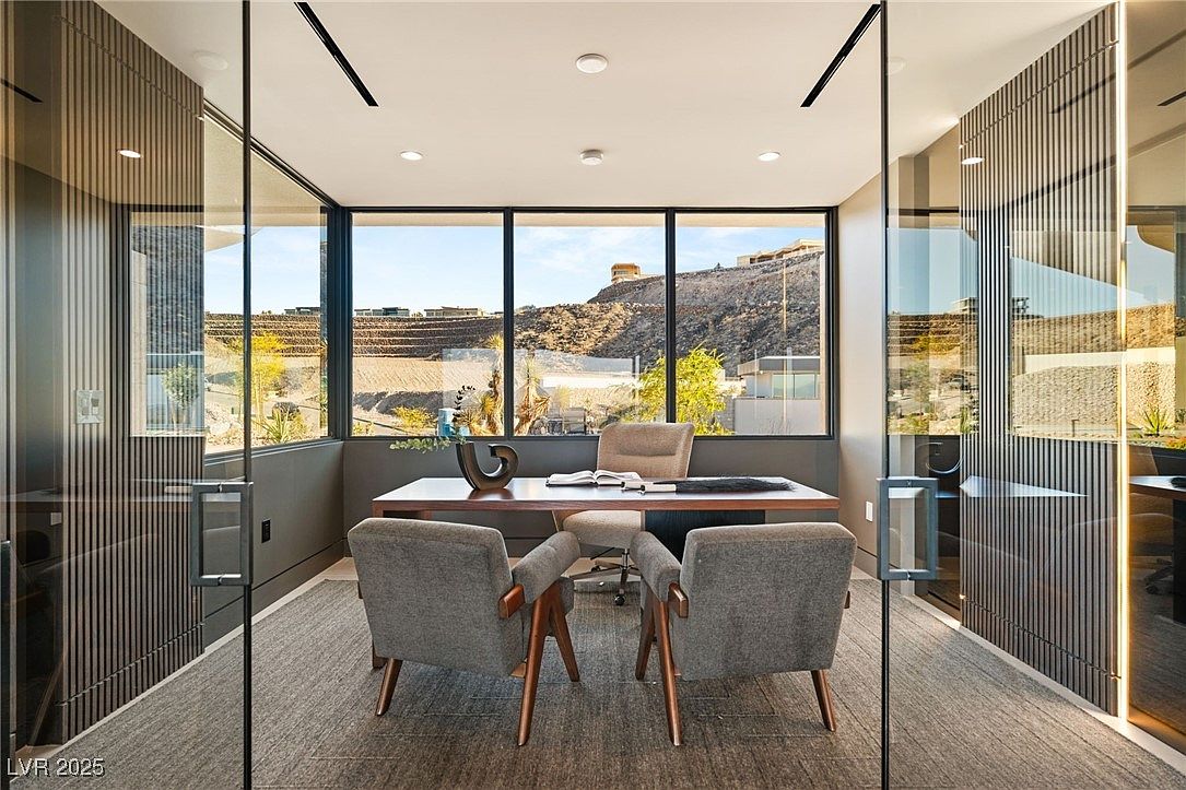 A sophisticated home office features large floor-to-ceiling windows, offering abundant natural light and expansive mountain views to foster productivity and inspiration. Glass walls create an open layout while maintaining sound privacy, and sleek vertical paneling adds a touch of modern elegance. The decor is minimalist, with a neutral color palette of taupes and grays to promote calm and focus. Mid-century-inspired armchairs face a contemporary wood desk, allowing for comfortable meetings or study sessions. This office is ideal for families seeking a tranquil spot to work or study from home, blending style, comfort, and functionality in one inviting space.
