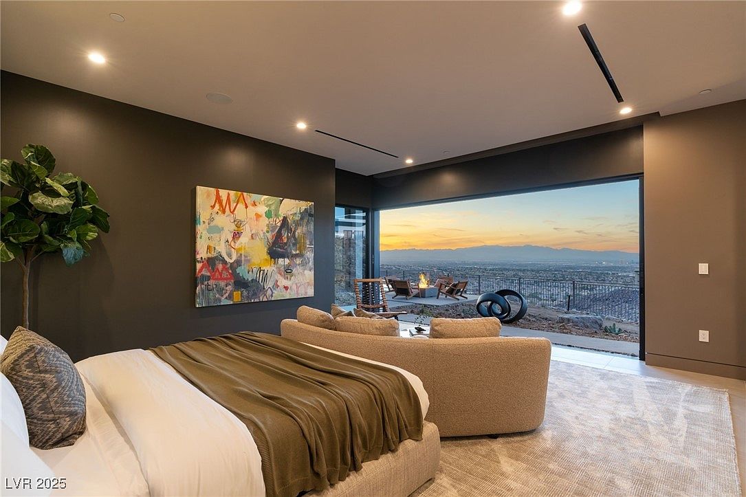 This spacious primary bedroom features serene, modern aesthetics with a neutral color palette dominated by soft grays and earth tones. A plush bed draped with cozy linens and flanked by textured pillows sits against a charcoal accent wall adorned with contemporary abstract art. The room’s open layout includes a curved, inviting sofa, perfect for relaxing or family time. Large sliding glass doors frame an expansive view of the city and mountains, seamlessly connecting the bedroom to an outdoor lounge with a fire pit. Soft carpeting, minimalistic decor, and natural light make the space feel tranquil and welcoming for all family members.