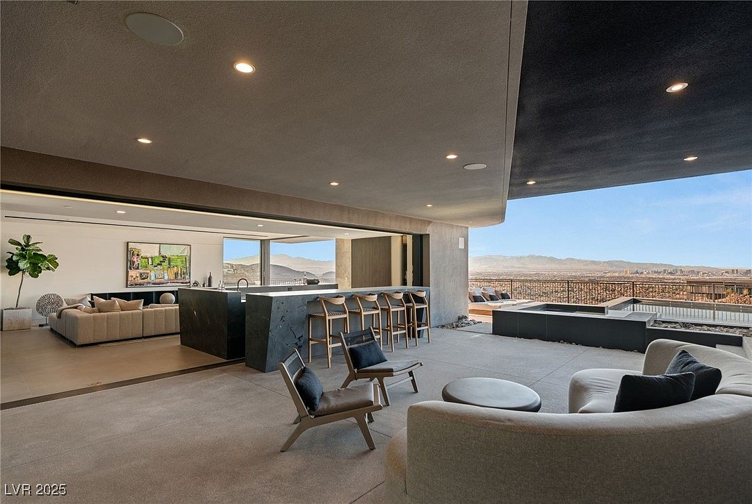 This stylish outdoor lounge seamlessly blends indoor and outdoor living, offering a spacious open-concept layout perfect for entertaining and family gatherings. Sleek concrete floors, modern black marble countertops, and wooden bar stools create a sophisticated yet welcoming atmosphere. Comfortable seating, including a curved sofa and accent chairs, invites relaxation while enjoying expansive views of the city and desert landscape beyond. Neutral tones and soft lighting enhance the contemporary aesthetic. The layout allows for easy movement between the indoor living area, outdoor bar, and patio, making the space both family-friendly and ideal for hosting guests.