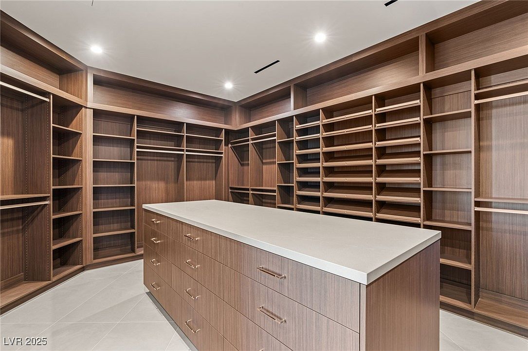 This expansive walk-in closet exudes contemporary sophistication, featuring custom built-in shelving, ample hanging space, and a generous central island with sleek drawers for extra storage. The warm wood finishes create an inviting yet upscale ambiance, while recessed lighting brightens the space for easy organization. Open shelving and adjustable racks offer maximum flexibility for keeping clothing, shoes, and accessories neat and accessible, making it ideal for busy families. The spacious layout accommodates multiple users simultaneously, and the streamlined cabinetry adds a touch of modern luxury to the home, making morning routines effortless for everyone.