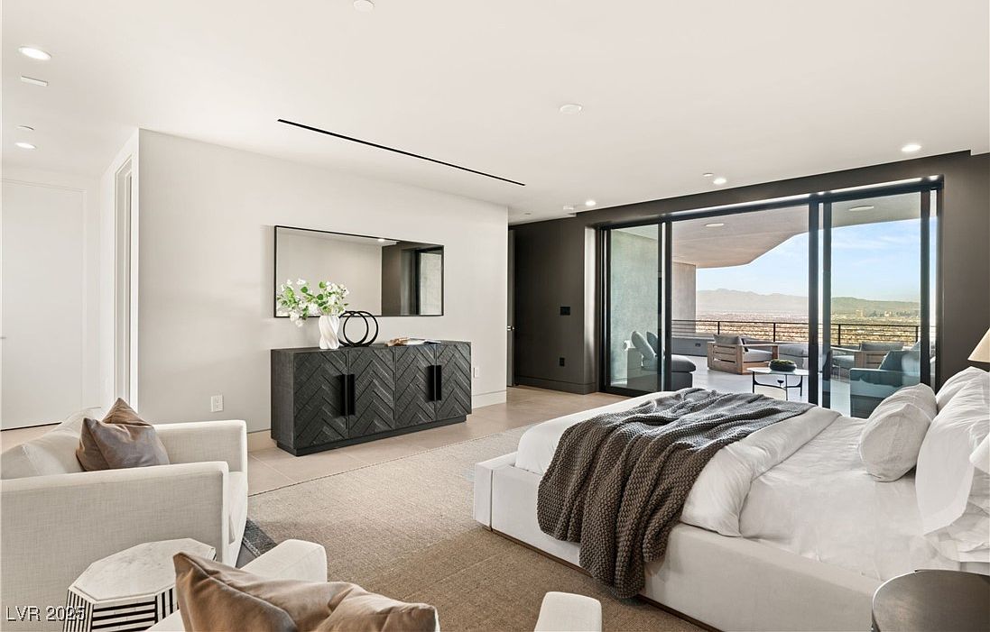 A spacious primary bedroom blends comfort and elegance, featuring floor-to-ceiling sliding glass doors that open to a private balcony with panoramic city and mountain views. The soft neutral palette of creamy whites, beiges, and subtle gray accents instills a tranquil atmosphere, while plush textiles and a knitted throw layer the king-size bed for a cozy family oasis. Lounge chairs and a textured area rug invite relaxation and together time. Architectural details, like recessed lighting and a sleek modern credenza topped with chic decor, add sophistication. The open layout ensures seamless flow and ample natural light, creating a restful haven for every family member.