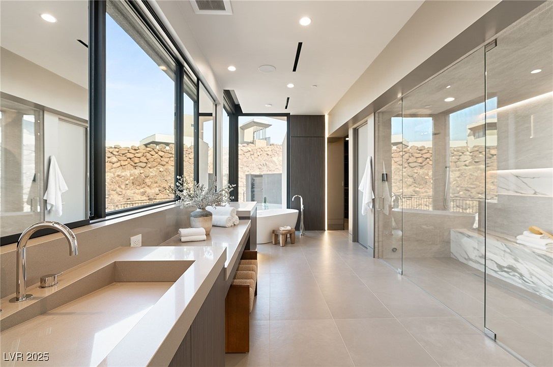 Spacious and bathed in natural light from a wall of oversized windows, this master bathroom blends luxurious comfort with sleek modern design. A long double vanity stretches beneath the windows, offering ample counter space and under-counter seating, perfect for family routines. The freestanding soaking tub is nestled next to the windows, creating a tranquil spa-like ambiance, while the generous glass-enclosed walk-in shower features marble accents and built-in shelving. Soft, neutral tones in the cabinetry and floor tiles enhance the clean, serene feel, making this bathroom both stunningly elegant and practical for everyday family living.