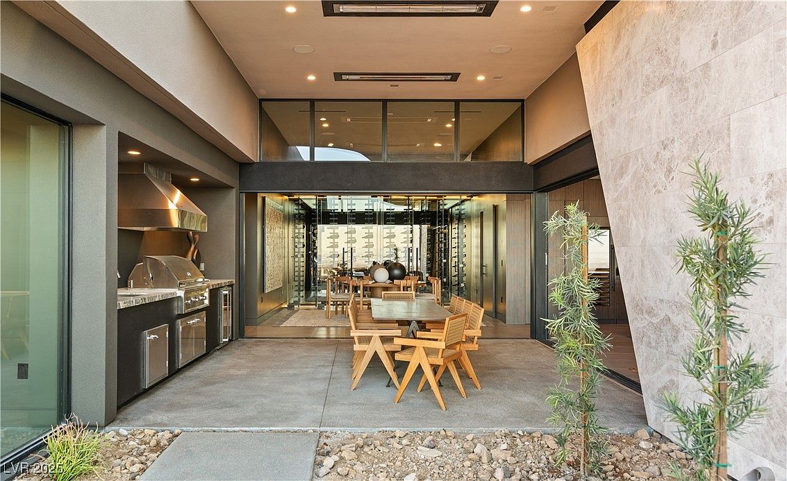 This modern outdoor dining patio features an inviting blend of indoor and outdoor living with seamless transitions through glass sliding doors. The space boasts a built-in stainless steel grill and countertop, perfect for family barbecues or entertaining guests. Warm wooden furnishings, including a large dining table and comfortable chairs, make this area ideal for gatherings. Overhead recessed lighting and neutral-toned walls enhance the open, airy feel. The adjacent wine wall behind glass adds a touch of luxury, while greenery and stone accents soften the atmosphere, creating a stylish yet family-friendly retreat for meals and relaxation.