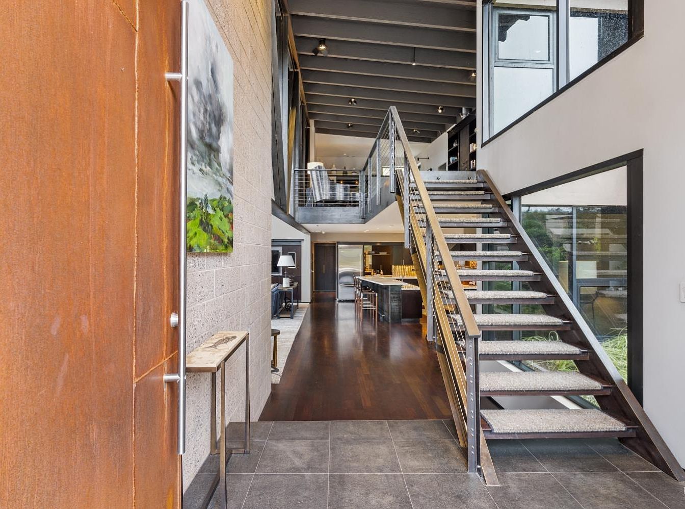 This stunning entryway creates a warm welcome with its contemporary flair. Featuring high ceilings and large windows, the space is flooded with natural light, enhancing the rich wood flooring that leads to an inviting open-concept layout. The combination of stone and industrial accents, including a sleek metal staircase, complements the artistic wall decor. A minimalist console table offers a stylish touch while maximizing functionality, ideal for a family with children. The color palette, a harmonious blend of earthy tones and modern gray, evokes sophistication, making this entryway a perfect introduction to the home’s aesthetic.