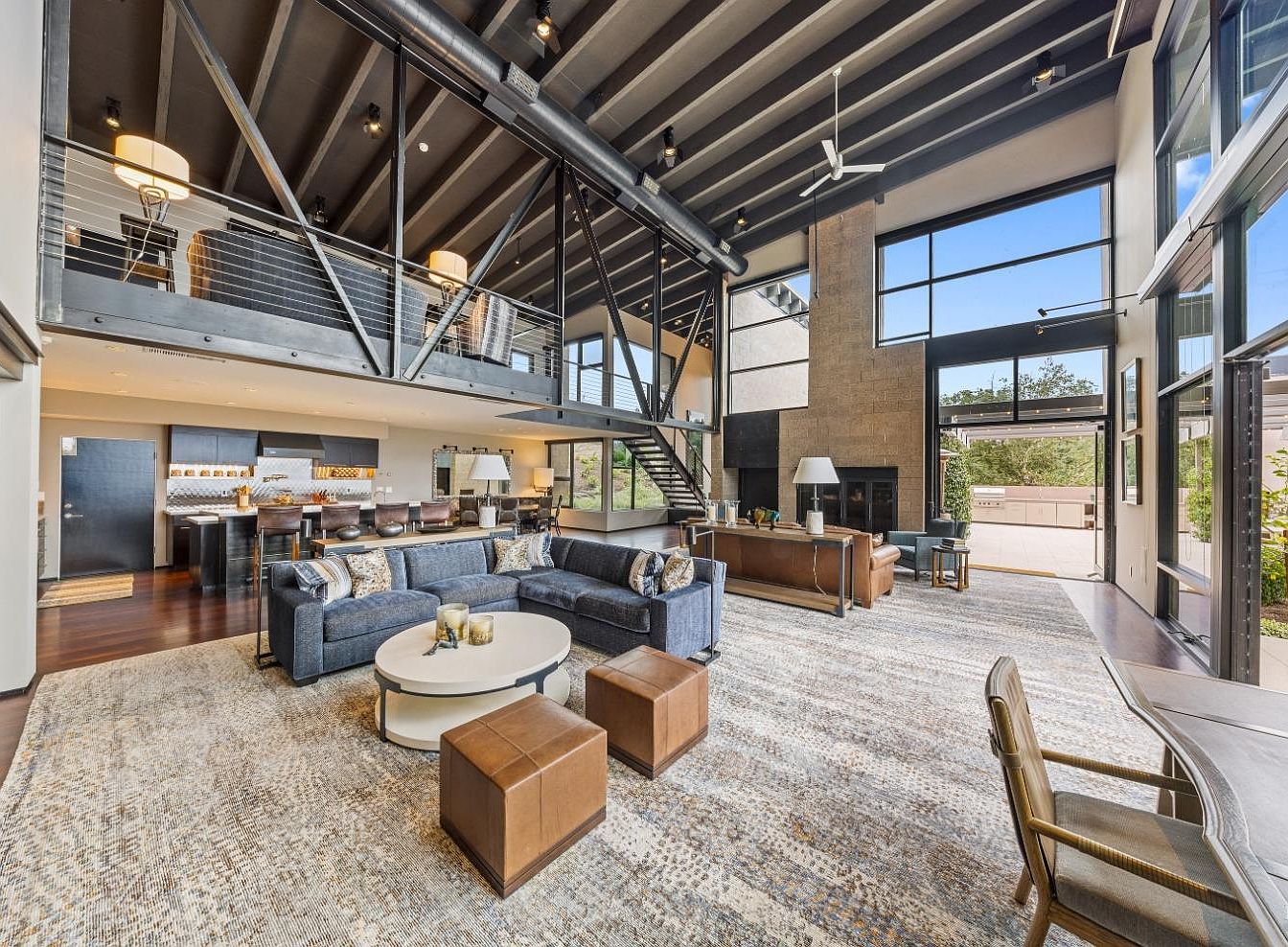 A spacious open living area showcases a modern design with high, exposed beam ceilings and large windows that invite natural light. The inviting sectional sofa, adorned with plush cushions, contrasts beautifully against the rich wooden flooring. A circular coffee table sits at the center, complemented by stylish brown ottomans. The layout seamlessly connects to the gourmet kitchen, featuring sleek cabinetry and an expansive island ideal for family gatherings. Family-friendly elements are evident, from the cozy seating arrangement to the warm color palette of blues and browns, enhancing the comfort and functionality of this contemporary home space.