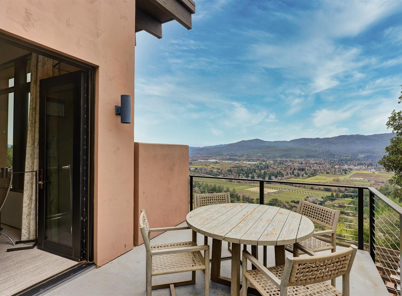 This outdoor patio offers an inviting space for relaxation and gathering, featuring a rustic, round wooden table surrounded by four comfortable chairs. The weathered finish of the table enhances its charm, blending seamlessly with the natural surroundings. A sleek black railing provides safety while framing stunning panoramic views of rolling hills and vast landscapes. The gentle earth tones of the stucco walls harmonize with the serene blue sky, creating a tranquil aesthetic. Perfect for family gatherings or peaceful evenings, this patio is an ideal retreat to enjoy the beauty of nature and unwind.
