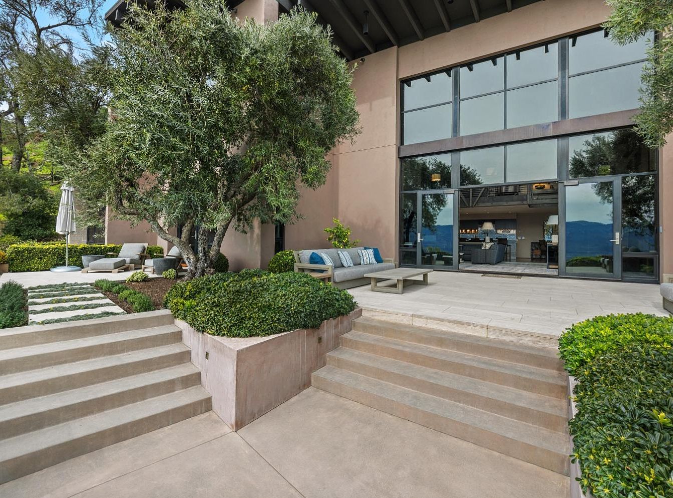 This stunning outdoor living space seamlessly blends nature with contemporary design. The inviting patio features a comfortable sectional sofa adorned with blue and white cushions, perfect for gatherings or quiet afternoons. Strategically placed landscaping includes neatly trimmed hedges and decorative plants, enhancing the serene atmosphere. An elegant umbrella offers shade for warm days, complementing the natural stone steps that lead up to the main entrance. Large glass doors invite ample natural light, connecting the outdoors with the stylish indoor living area visible through the expansive windows, showcasing a harmonious blend of indoor comfort and outdoor tranquility.