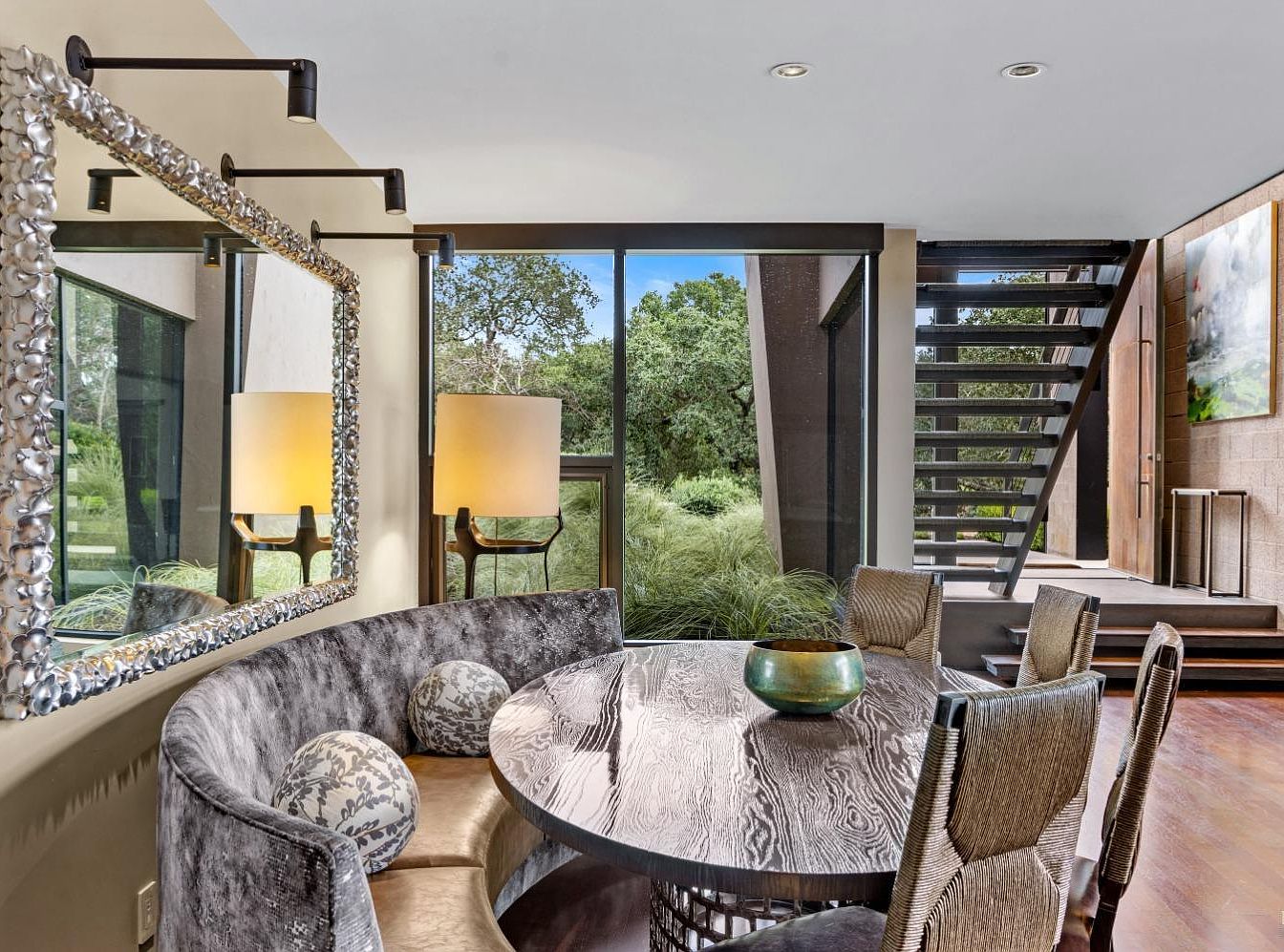This inviting dining area features a unique half-moon banquette adorned with plush fabrics and patterned cushions, encouraging family gatherings. A sleek, round wooden table takes center stage, complemented by stylishly textured chairs, enhancing comfort and aesthetics. The warm, earthy color palette blends with natural light streaming through expansive glass windows, creating an airy atmosphere. Decorative elements include a striking, contemporary mirror that reflects both style and spaciousness. Warm lighting from chic lamps ensures a cozy, intimate setting, while the seamless connection to the outdoor greenery evokes a sense of tranquility, perfect for leisurely meals and family interactions.