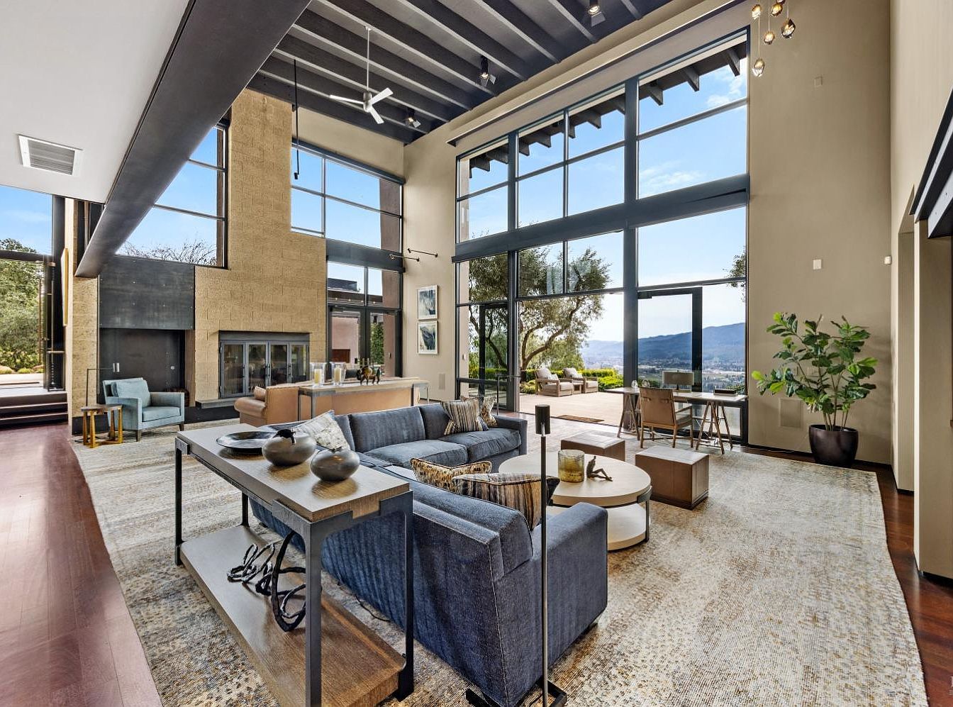 This spacious living room showcases a harmonious blend of modern aesthetics and functionality. High ceilings with exposed beams and large windows flood the space with natural light, while offering stunning views of the surrounding landscape. The warm hardwood flooring pairs beautifully with a contemporary area rug that anchors the seating area, featuring plush sofas and stylish accent chairs. Sleek, minimalist furniture complements the overall design, with dark cabinetry providing ample storage. The open layout encourages family gatherings, with carefully placed lighting creating a cozy atmosphere, making this room an inviting retreat for both relaxation and entertainment.