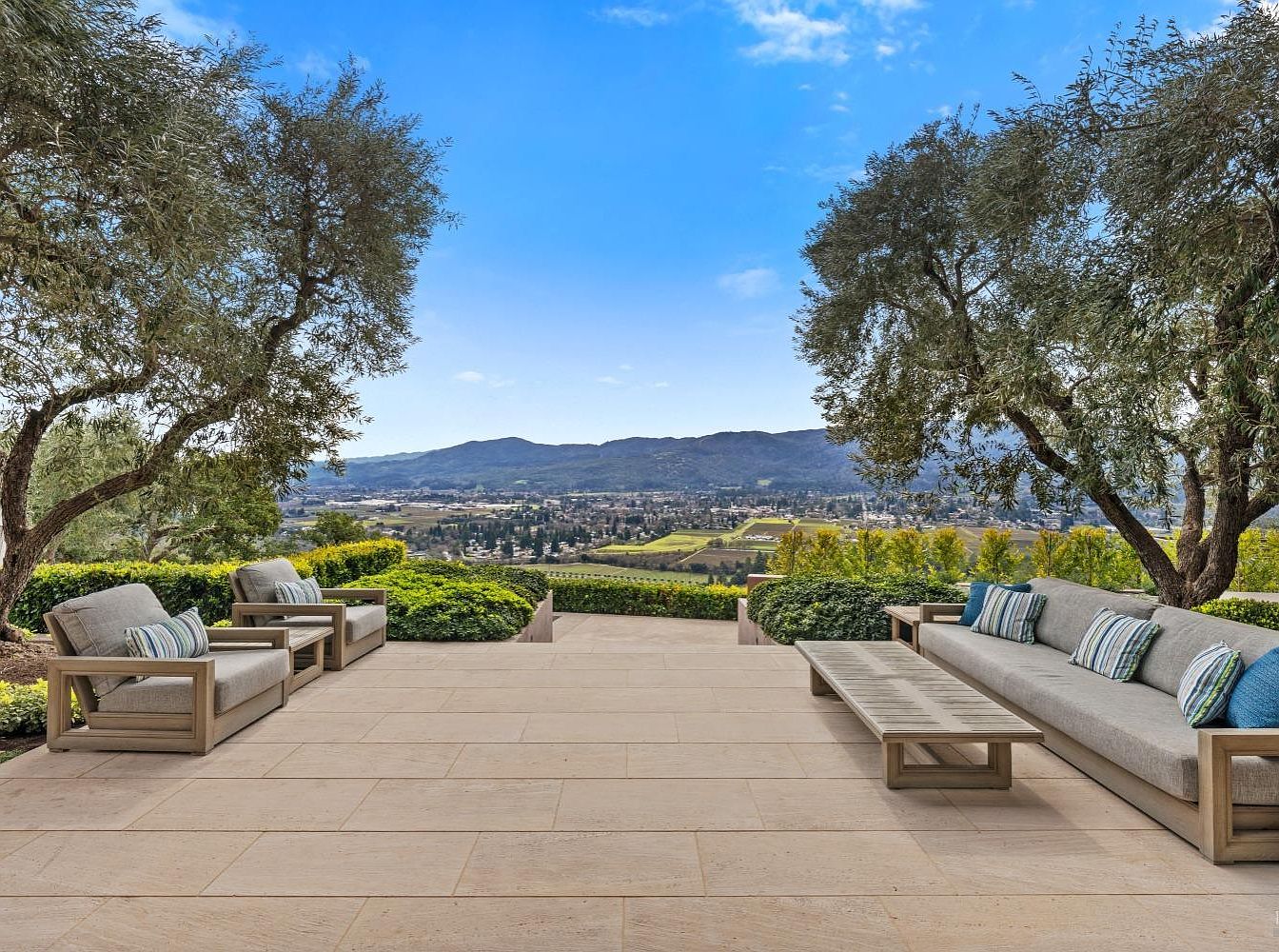 This exquisite outdoor living space features a stunning patio, designed for relaxation and entertaining while showcasing breathtaking mountain views. The layout includes cozy, cushioned seating arrangements with elegant wood framing, complemented by vibrant striped throw pillows for added comfort. The expansive stone flooring extends seamlessly into the surrounding greenery, creating a harmonious connection with nature. Lush landscaping, including trees and vibrant hedges, enhances privacy and tranquility. Ample sunlight floods the area, making it a perfect family-friendly retreat for gatherings or peaceful evenings, where you can enjoy the serene ambiance while soaking in the picturesque scenery.