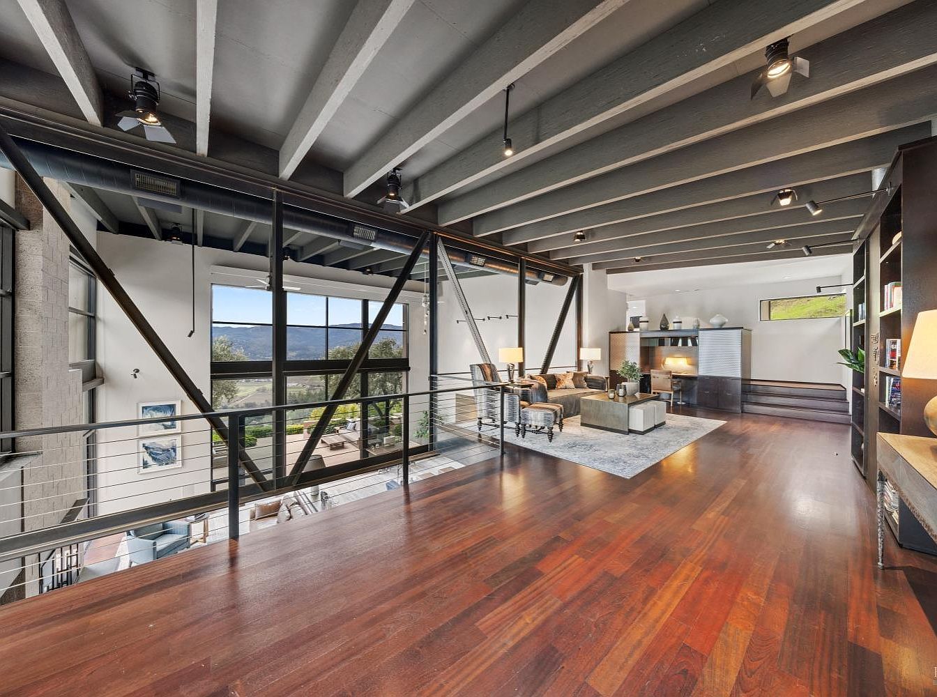 Spacious and airy, this living room showcases a modern aesthetic with an open layout and large windows that invite natural light. The rich brown hardwood flooring contrasts beautifully with the soft, neutral tones of the furniture, including a plush sectional sofa adorned with colorful throw pillows. Architectural details such as exposed beams and a minimalist railing add character. A contemporary coffee table with storage options enhances functionality, while accent lighting from stylish table lamps creates a warm ambiance. With comfortable seating and a serene view, this room offers a welcoming space for family gatherings and relaxation.