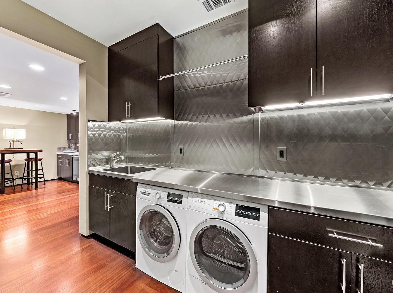 This modern laundry room effortlessly blends functionality with style. The sleek stainless-steel countertops complement the rich, dark cabinetry, creating a striking contrast. A spacious layout allows for ease of movement, while the two front-loading washers offer efficiency and convenience. Generous cabinetry provides ample storage for laundry essentials, maintaining a clutter-free environment. An elegant diamond-patterned backsplash adds a touch of sophistication. With warm wooden flooring, the room exudes a cozy atmosphere, perfect for busy families. Thoughtful lighting enhances the space, ensuring a comfortable atmosphere for chores. This laundry room is a perfect example of modern design meeting practicality.