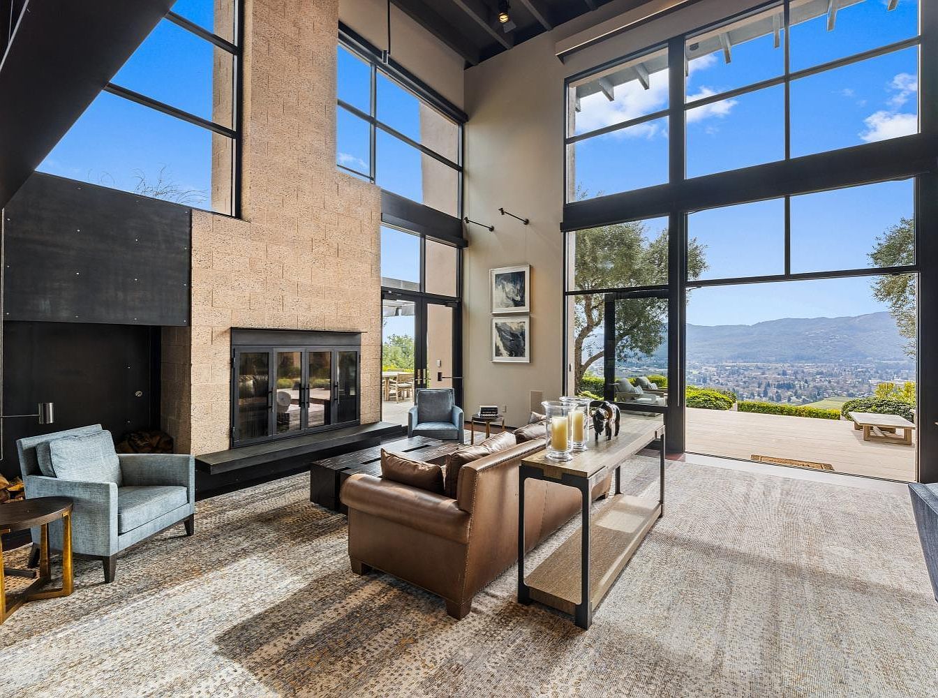 This spacious living room boasts soaring ceilings and expansive windows that flood the area with natural light, showcasing stunning views of the surrounding landscape. The color palette features warm earthy tones, complemented by a rich leather sofa and modern accent chairs, creating a cozy yet sophisticated atmosphere. A sleek coffee table anchors the center of the room, while the textured area rug adds warmth. The focal point, a minimalist fireplace, contrasts beautifully with the stone wall, enhancing the room’s contemporary charm. Thoughtfully placed decor elements and accessible outdoor areas make this an inviting family-friendly space.