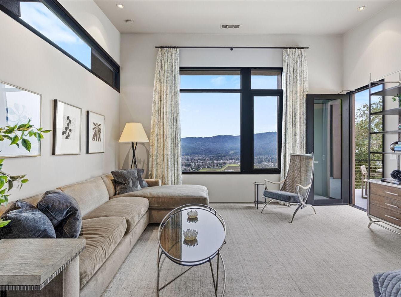 This contemporary living room blends comfort and elegance, showcasing a streamlined sectional sofa adorned with plush cushions in calming earth tones. Floor-to-ceiling windows invite natural light and frame breathtaking mountain views, enhancing the sense of openness. A sleek glass coffee table sits centered on a soft area rug, while delicate wall art adds a touch of sophistication. The light fabric drapes and chic floor lamp create a warm ambiance, contributing to a welcoming space perfect for family gatherings. Minimalist shelving and a stylish accent chair complete the design, embodying modern aesthetic while remaining family-friendly.