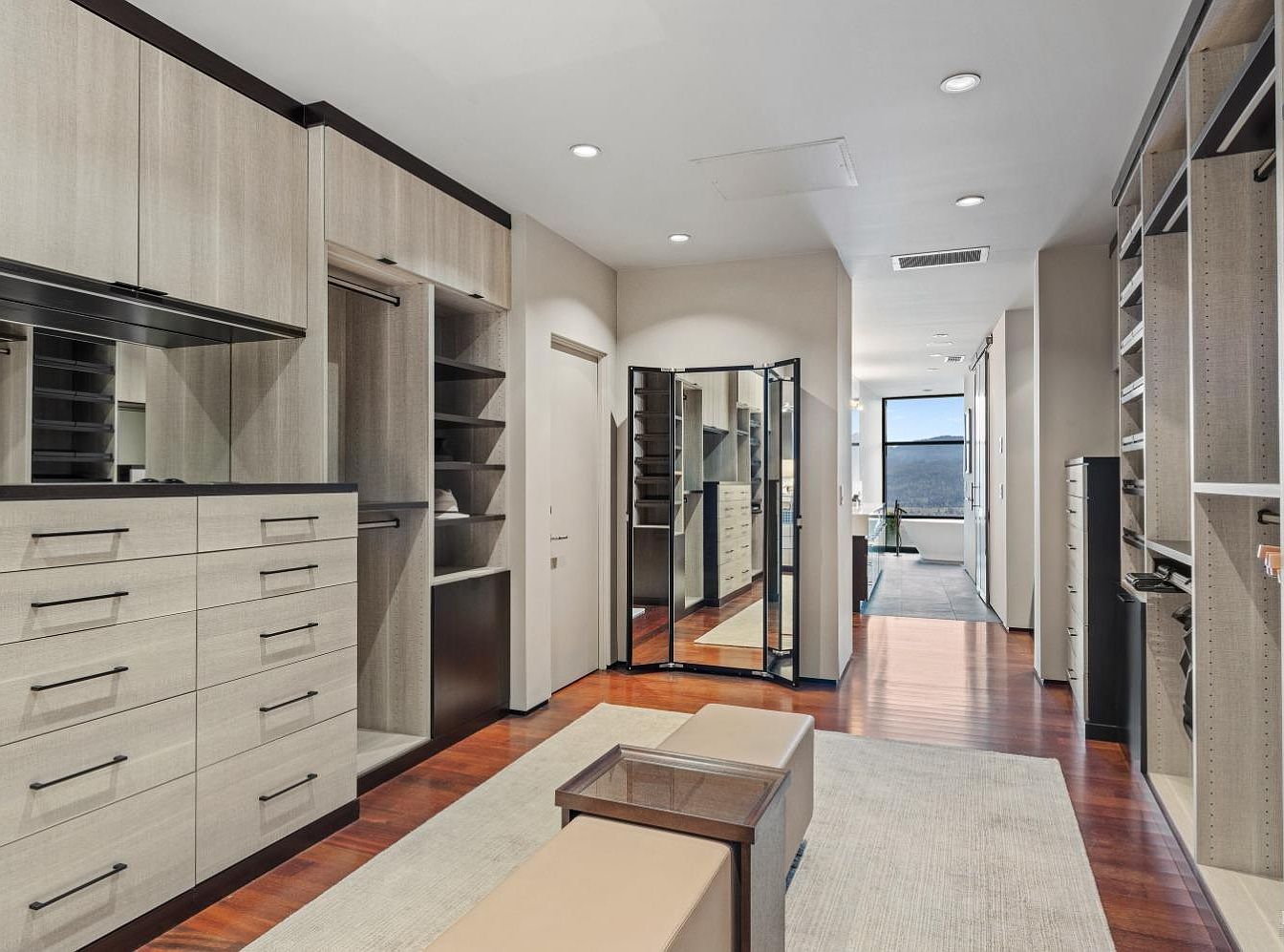 This spacious walk-in closet features modern, built-in cabinetry that offers ample storage with sleek drawers and open shelving. The warm wood flooring serves as a beautiful contrast to the neutral-toned cabinetry, creating a welcoming ambiance. A central bench provides a comfortable spot to sit while getting ready, adding to the family-friendly design. Full-length mirrors reflect natural light from the large window, enhancing the sense of space and brightness. Spotlights illuminate the room, highlighting its architectural details and creating a stylish yet functional area for organizing attire and accessories.