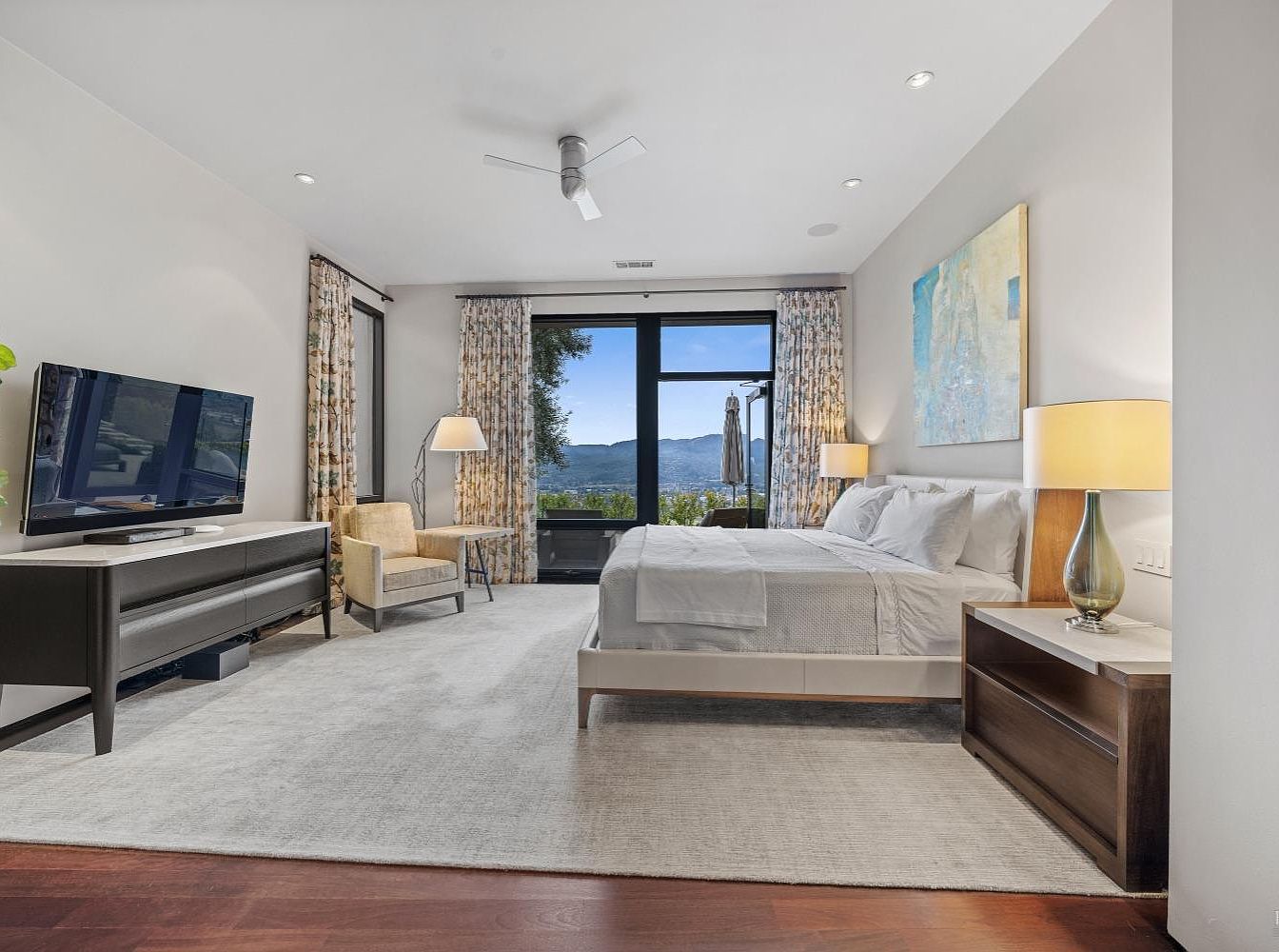 This spacious master bedroom features a serene color palette of soft whites and muted earth tones, promoting relaxation and tranquility. A contemporary king-sized bed is paired with sleek nightstands, complementing the modern aesthetic. Large windows frame breathtaking mountain views, inviting natural light and showcasing beautiful floral drapes that add a touch of elegance. A cozy reading nook, with a stylish armchair and sleek lamp, offers a perfect spot to unwind. The rich hardwood flooring contrasts beautifully with a plush area rug, creating warmth. Thoughtfully designed for comfort, this room encapsulates a perfect blend of style and functionality.