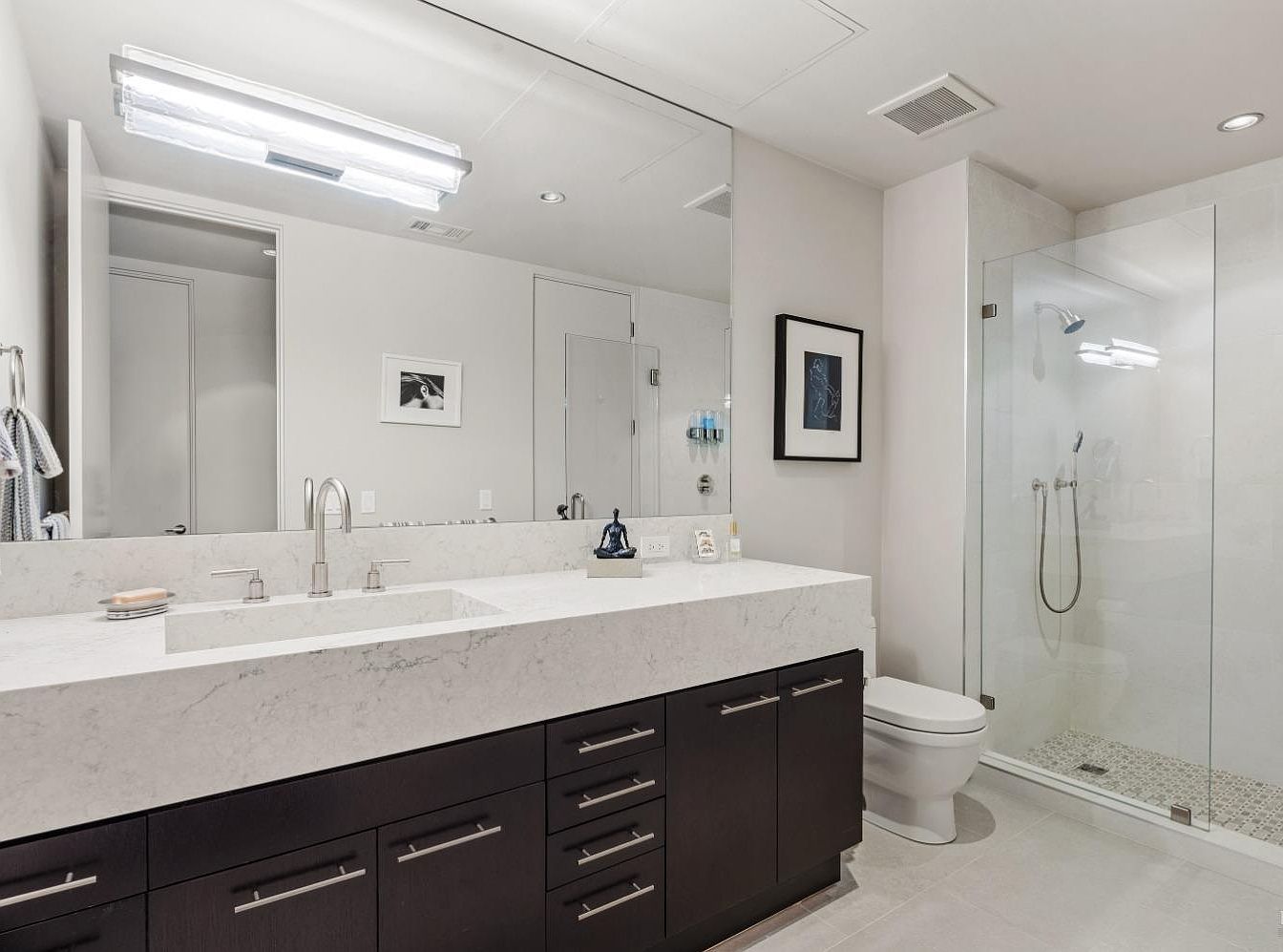 This sleek bathroom boasts a harmonious blend of sophistication and functionality. A spacious double vanity features a striking white marble countertop contrasted by dark wood cabinetry, offering ample storage. The contemporary faucets add a touch of elegance, while the large mirror enhances the illusion of space. Natural light floods in, highlighting the subtle gray tiles that run seamlessly through the area. To the side, a glass-enclosed shower showcases clean lines and modern fixtures, making it an inviting retreat. Tasteful art pieces and carefully chosen accessories introduce a personal touch, elevating the overall aesthetic and ambiance.