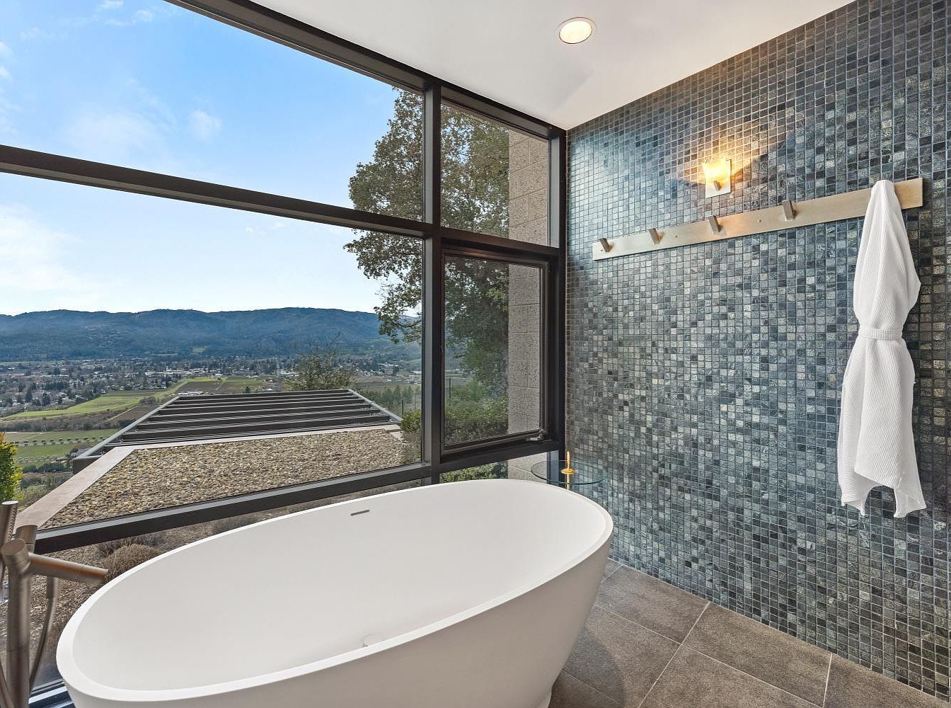 This exquisite bathroom harmonizes luxury with nature, featuring floor-to-ceiling windows that frame breathtaking mountain views. A sleek freestanding bathtub offers a serene focal point, while the sophisticated tile work in varying shades of blue adds depth and elegance. The minimalist design is enhanced by contemporary fixtures and a practical towel rack. A spacious layout promotes a feeling of openness, making it perfect for relaxation. Natural light pours in, illuminating the high-quality materials used throughout, creating a tranquil oasis. Ideal for families seeking both comfort and style, this bathroom blends modern aesthetics with a peaceful atmosphere.