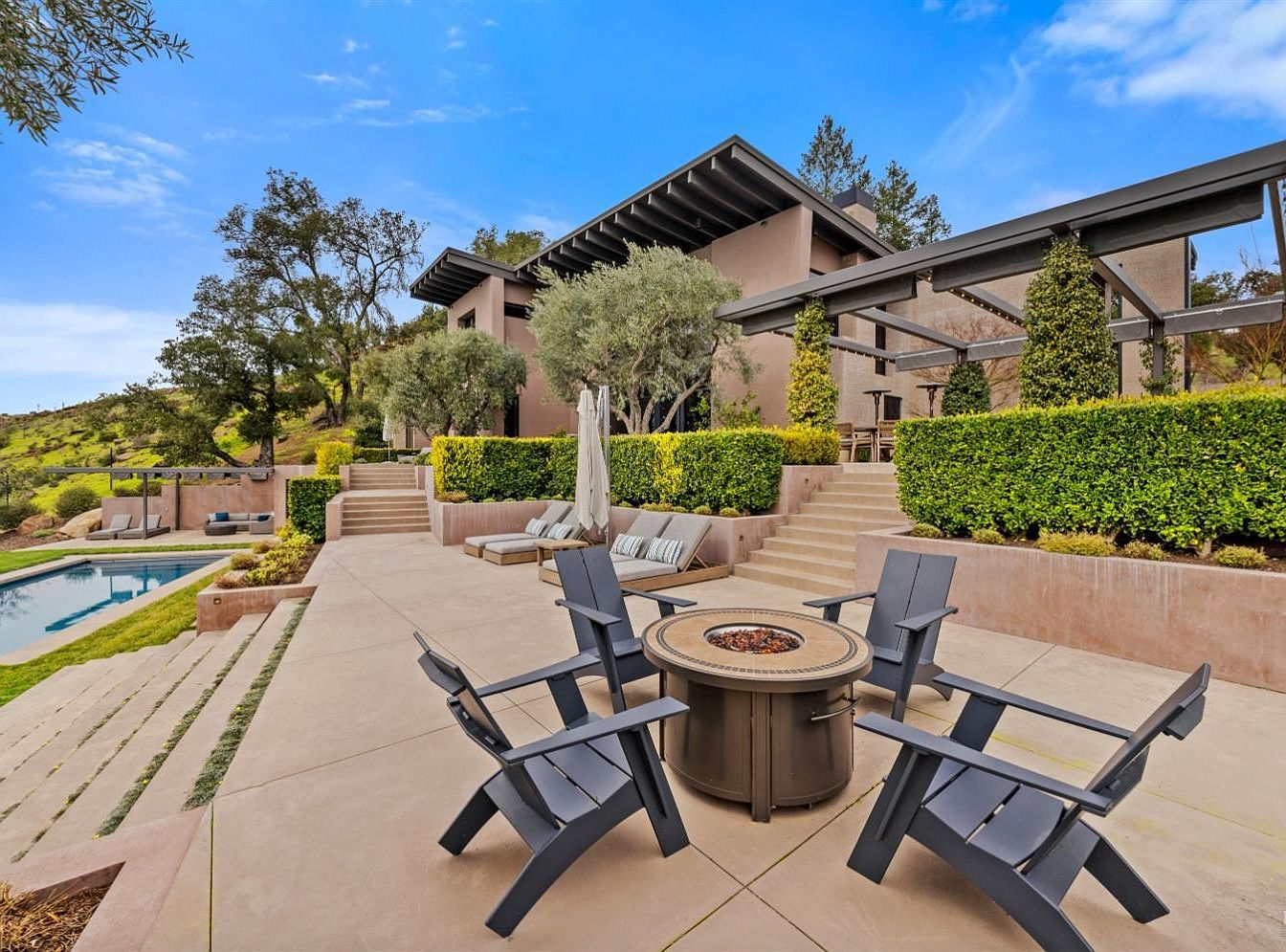 This stunning outdoor space seamlessly blends modern architecture with natural beauty. The home’s design features expansive glass windows, allowing light to flood in while providing breathtaking views of the surrounding landscape. The tiered patio offers multiple lounge areas, ideal for entertaining guests or enjoying family time. A large rectangular swimming pool invites relaxation, framed by manicured lawns and lush greenery. The color palette includes soft earth tones, complementing both the exterior and the natural environment. Stylish seating arrangements and modern landscaping create a welcoming atmosphere, making it perfect for gatherings or peaceful escapes.