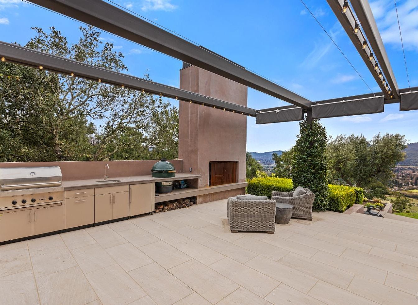 This captivating outdoor kitchen features a spacious layout designed for entertaining and family gatherings. A built-in stainless steel grill and sink provide all essential amenities for outdoor cooking, complemented by a sleek, modern countertop. The area boasts comfortable wicker seating, inviting relaxation amidst nature, while large sliding doors connect seamlessly with the indoor space. Rich earth tones enhance the warm feel of the surroundings, harmonizing with the lush greenery and scenic views. Architectural details like the expansive awning ensure shade and comfort, making this space perfect for alfresco dining and enjoying quality time with loved ones.