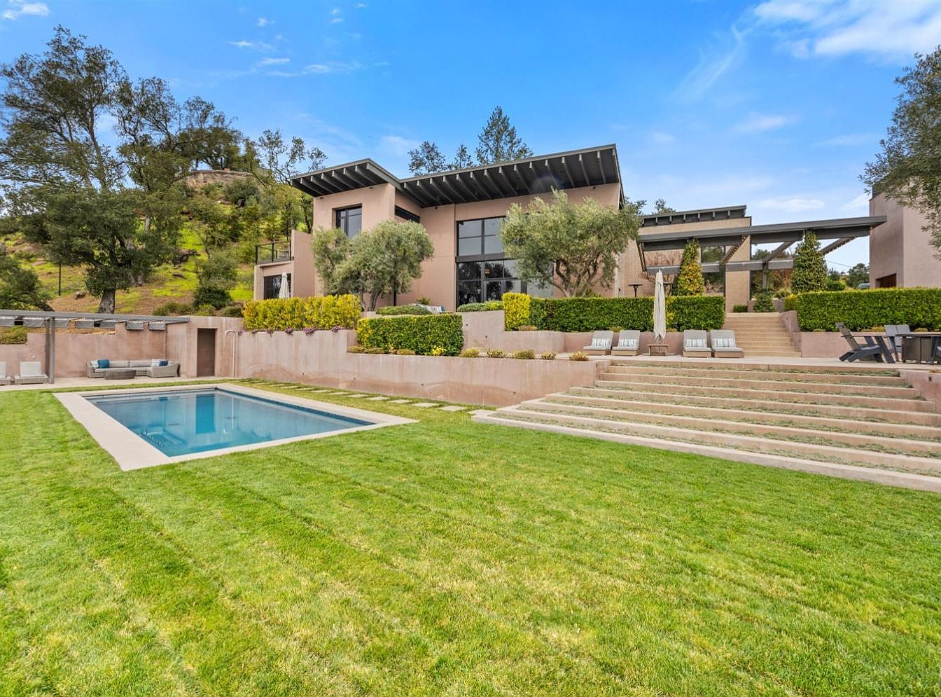 Perched on 40 acres in Saint Helena, this modern-industrial estate, built in 2006, epitomizes luxury and success. With a striking design featuring 25-foot ceilings and expansive glass walls, it combines sophistication with comfort, making it ideal for future-oriented individuals. The home boasts en-suite bedrooms for privacy, a gourmet kitchen, and seamless indoor-outdoor living, complemented by resort-like amenities including a pool, outdoor kitchen, and bocce ball court. Located near fine dining and world-class wineries, the estate’s historical significance and appeal are unparalleled. Priced at $10.8 million, it offers a total square footage of 5,000+, reflecting a blend of contemporary style and natural beauty, enhancing the serene Napa Valley experience.