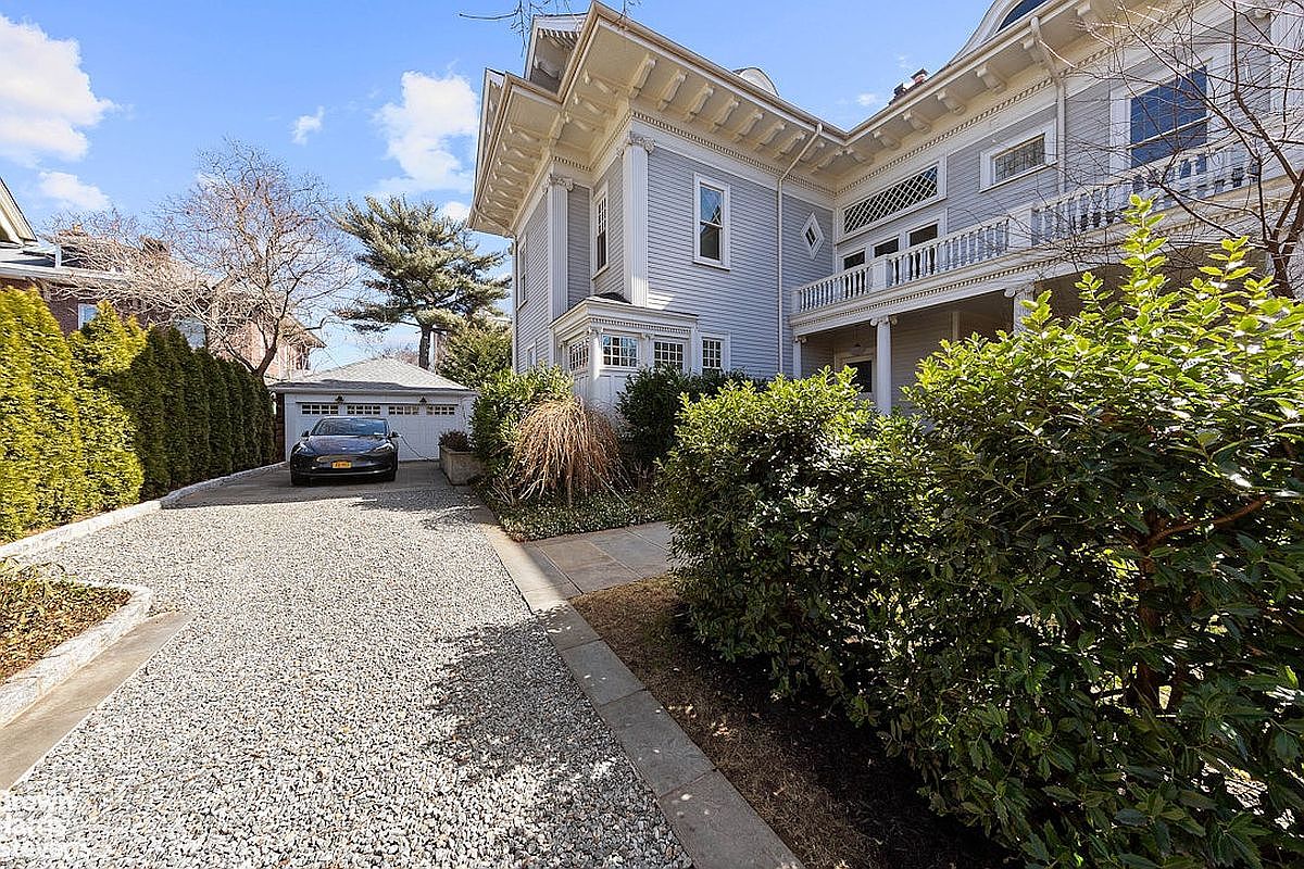 A spacious, gravel-paved driveway leads up to a detached garage, framed by meticulous hedges and mature trees that create both privacy and an inviting atmosphere. The classic American home, painted in soft gray with crisp white trim, features elegant Victorian-style columns and detailed cornice moldings. The exterior also showcases a sunlit porch with decorative railing, perfect for relaxing outdoors with family. Generous plantings and shrubbery line the walkway, adding lush greenery for curb appeal, and providing a safe, family-friendly environment for children to play outdoors or for hosting gatherings in the front yard.