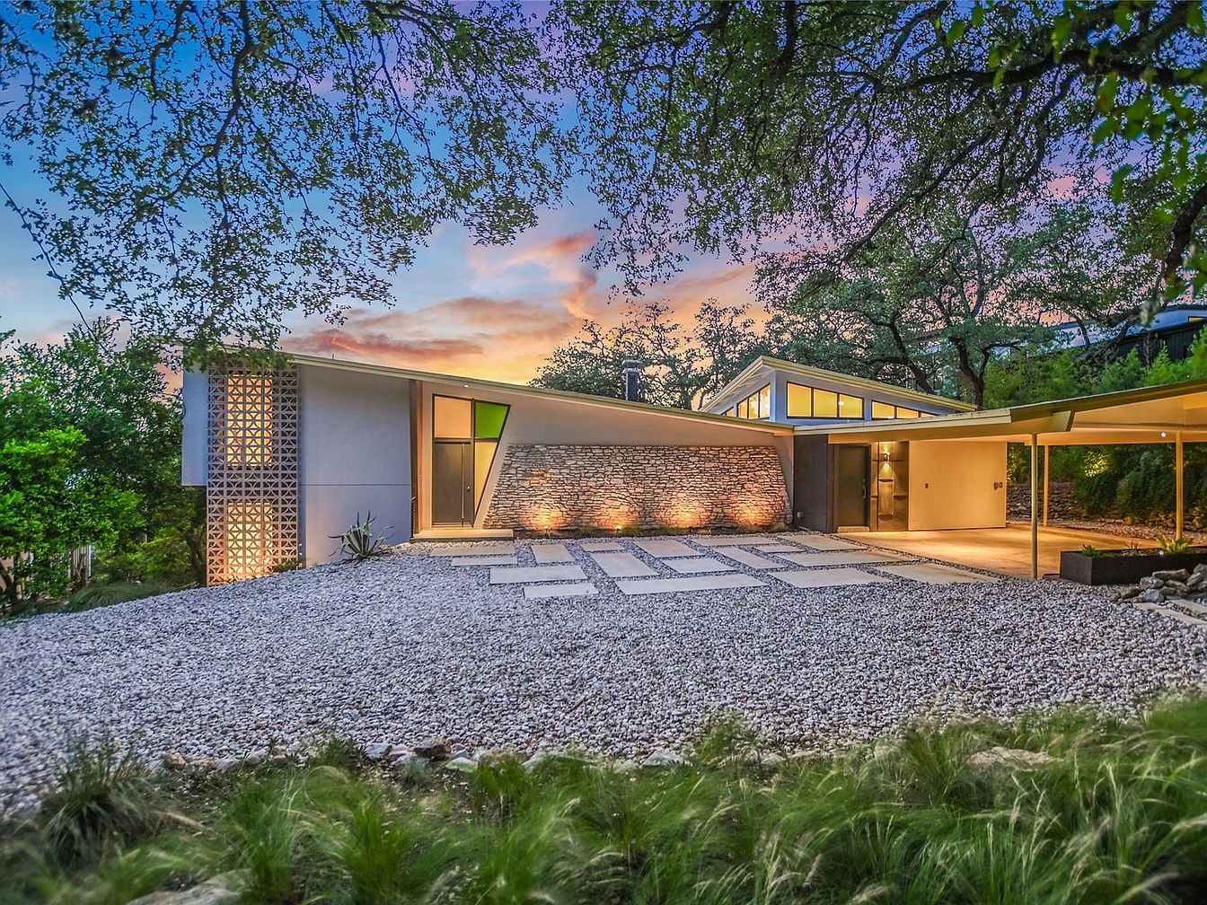 A beautifully designed backyard patio offers a seamless transition between indoor and outdoor living, highlighted by a modern, spacious dining table perfect for family gatherings or casual entertaining. Surrounded by lush greenery and mature shade trees, this inviting space features comfortable seating, including loungers and accent chairs ideal for relaxation. The stone flooring provides a clean, upscale look, while the stainless steel grill encourages outdoor cooking and barbecues. Neutral tones in the furniture and soft gray siding on the home create a calming, cohesive aesthetic, making this backyard an idyllic retreat for all ages to enjoy.