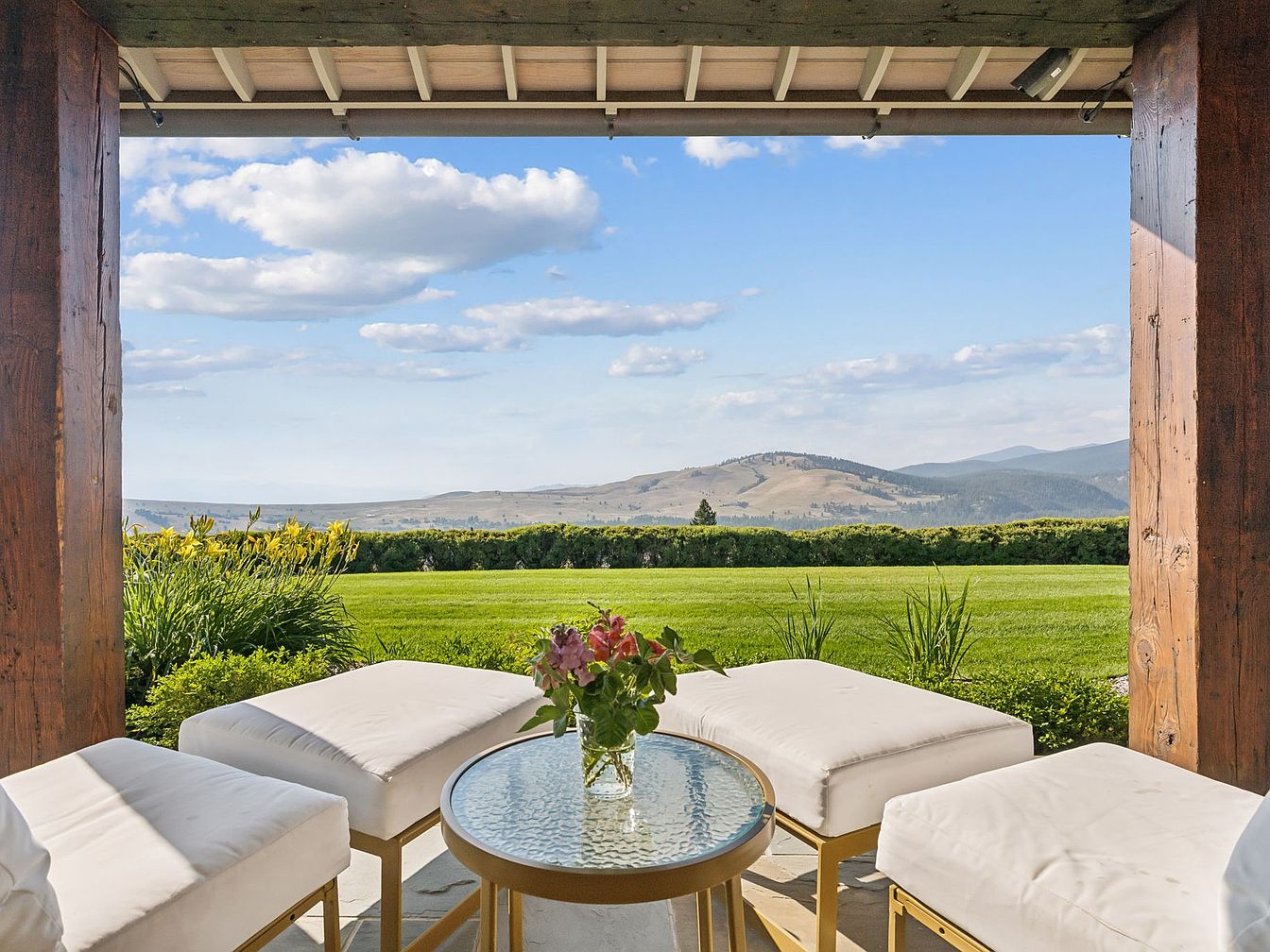 An inviting covered patio looks out over a vast, lush green lawn and distant rolling hills, offering a serene backdrop perfect for relaxing or entertaining. The space is framed with robust wooden beams, adding a touch of rustic charm that seamlessly integrates with the natural surroundings. Plush, white cushioned ottomans circle a glass-topped table with a fresh floral arrangement, providing a cozy and family-friendly spot for morning coffees or evening conversations. The area’s open layout encourages easy movement, making it ideal for gatherings, while the surrounding landscaping with vibrant flowers adds warmth and color to the tranquil outdoor setting.
