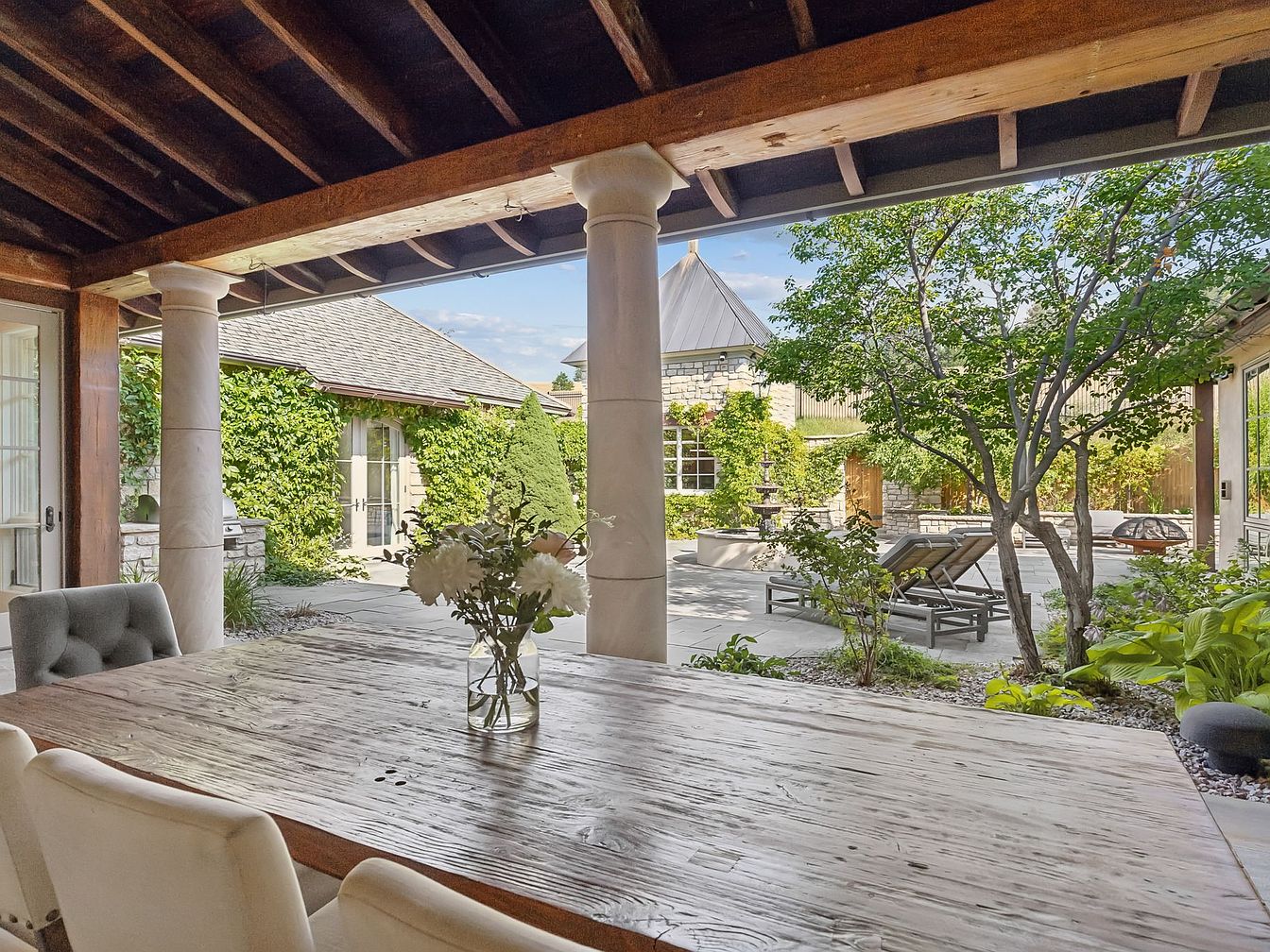 A spacious covered patio beautifully blends indoor comfort with outdoor living, featuring a rustic wooden dining table and plush, upholstered chairs ideal for family gatherings or entertaining guests. Thick, classical columns support the open-beam wooden ceiling, creating an elegant yet inviting atmosphere. The patio overlooks a serene courtyard with lush greenery, shade trees, and an immaculately maintained garden. Beyond, stone walls and ivy-clad facades add European charm, while lounge chairs encourage relaxation. The overall design showcases natural wood, neutral tones, and abundant sunlight, providing a perfect haven for both children and adults to enjoy casual meals, play, or unwind.