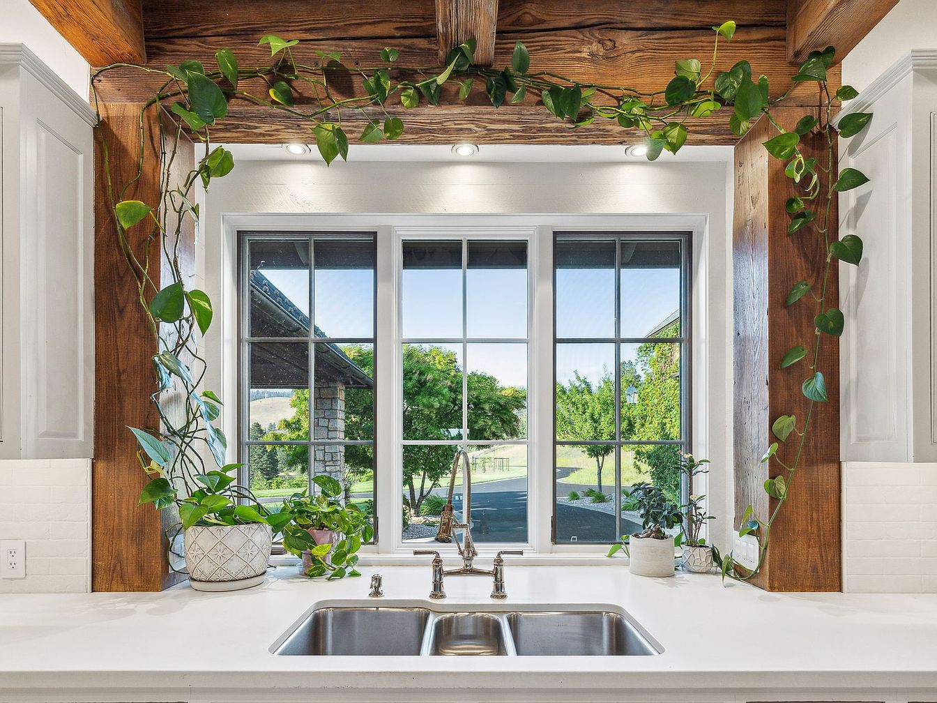 A bright and welcoming kitchen sink area is centered beneath a large multi-pane window that draws in natural light and frames a peaceful outdoor landscape. The clean white countertop and dual-bowl stainless steel sink offer plenty of space for daily tasks, while elegant chrome fixtures add a modern touch. Warm wooden beams above contrast beautifully with the crisp cabinetry and classic white subway tile backsplash. Potted trailing plants and leafy greenery bring a touch of nature indoors, creating a cheerful ambiance perfect for family activities and gatherings. The open view and natural elements make this kitchen space both soothing and functional.
