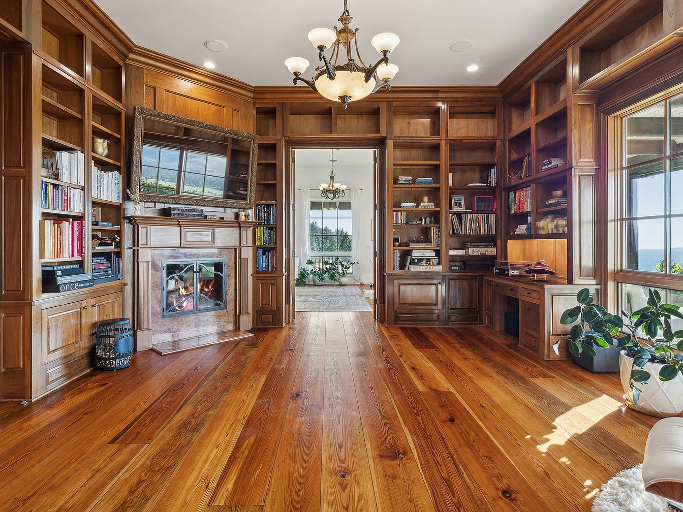 Warm, inviting custom wood paneling and built-in bookshelves line this sophisticated library and study, which features a cozy fireplace topped with a decorative framed mirror. Expansive windows allow natural light to pour in, creating an inspiring environment for reading or work. A spacious wooden desk is built seamlessly into the shelving, providing ample space for family members to study, play board games, or work on creative projects. The rich, honey-toned hardwood floors add warmth and visual continuity, while a classic chandelier sets an elegant tone above. The adjacent sun-filled sitting room and lush potted plants enhance the family-friendly, comfortable ambiance.