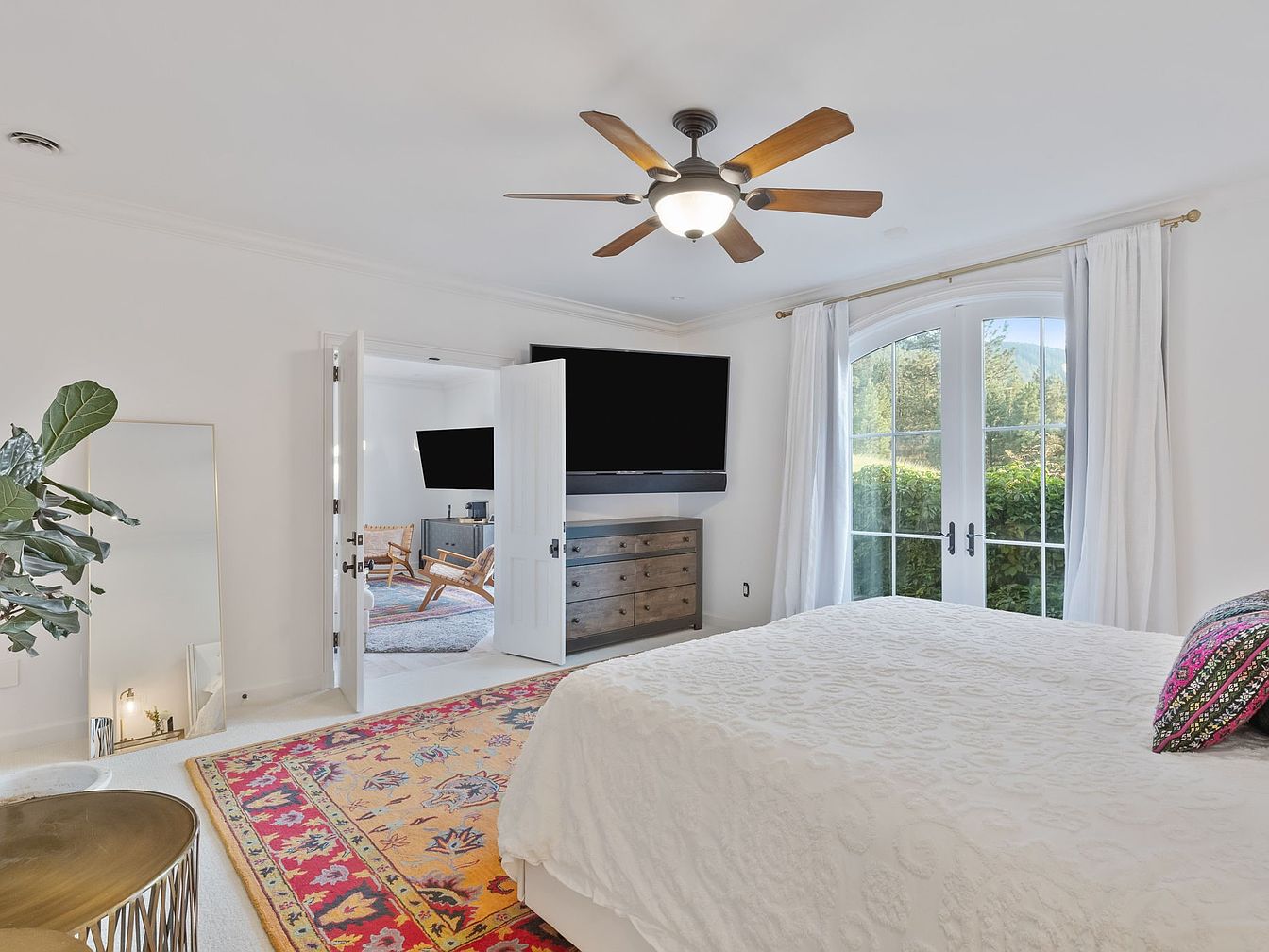 A serene and spacious bedroom featuring a bright, airy layout with French doors that allow abundant natural light and provide seamless access to a lush garden. The room’s neutral palette is elevated by crisp white walls and bedding, complemented by a vibrant, floral area rug that adds welcoming color. A ceiling fan with wooden blades and a statement light fixture offers both comfort and style. Family-friendly touches include plush carpeting beneath soft textiles and easy visibility to an adjoining living area furnished with modern, comfortable seating. A large standing mirror and elegant gold accent table enhance practical functionality and visual appeal.