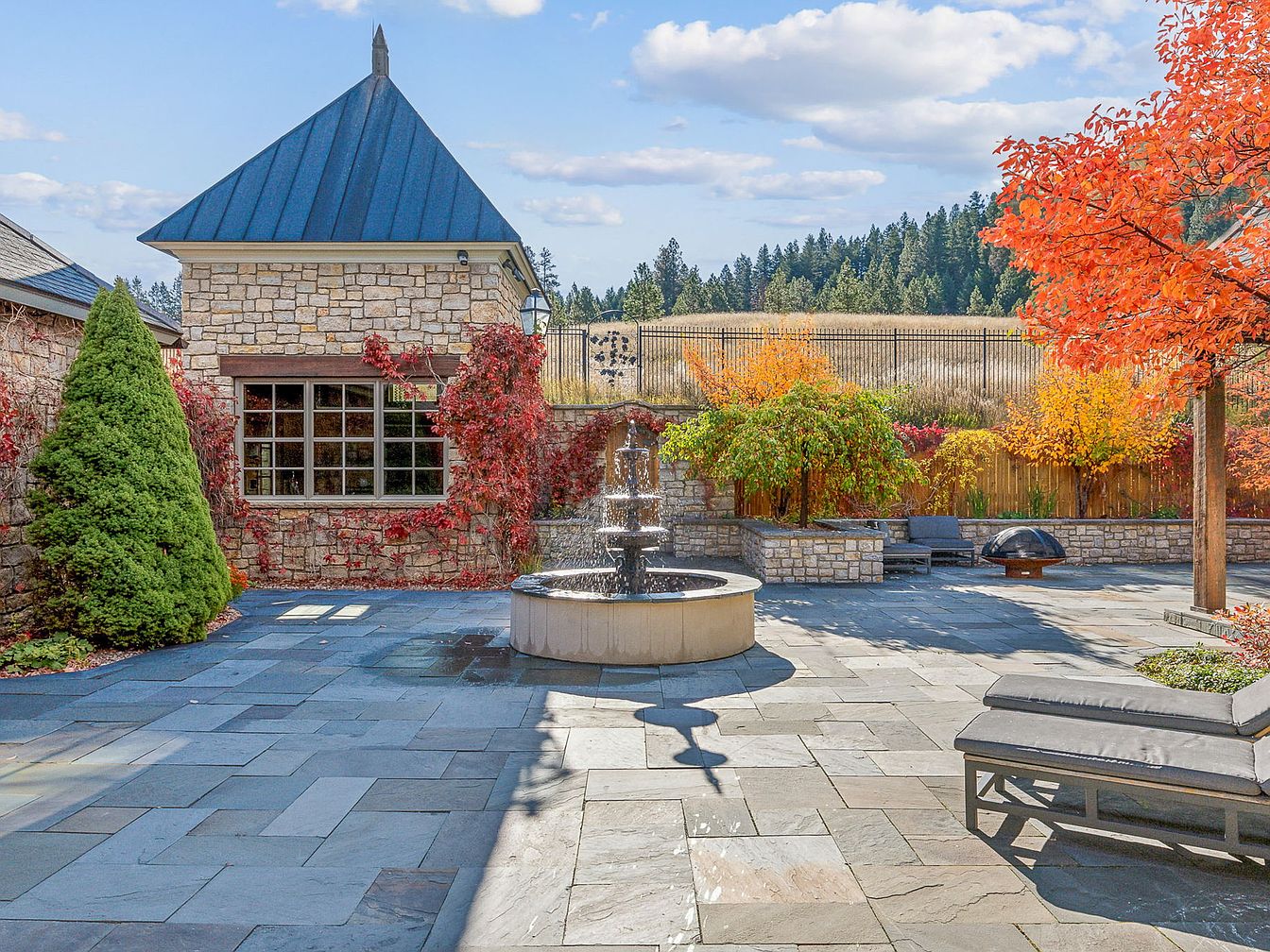 A spacious stone courtyard features a striking central fountain, creating a tranquil focal point perfect for gatherings and relaxation. Autumnal hues enhance the space, with mature trees displaying vibrant oranges and yellows alongside hearty evergreens. The classic stonework of the house and boundary walls bring a timeless, welcoming appeal. Ample lounge seating invites families to enjoy the outdoors, while a cozy fire pit corner adds warmth for evening enjoyment. Vining plants soften the architecture, climbing around large windows that allow abundant natural light inside. The expansive paver stones offer durability and safe play areas for children, balancing beauty and practicality.