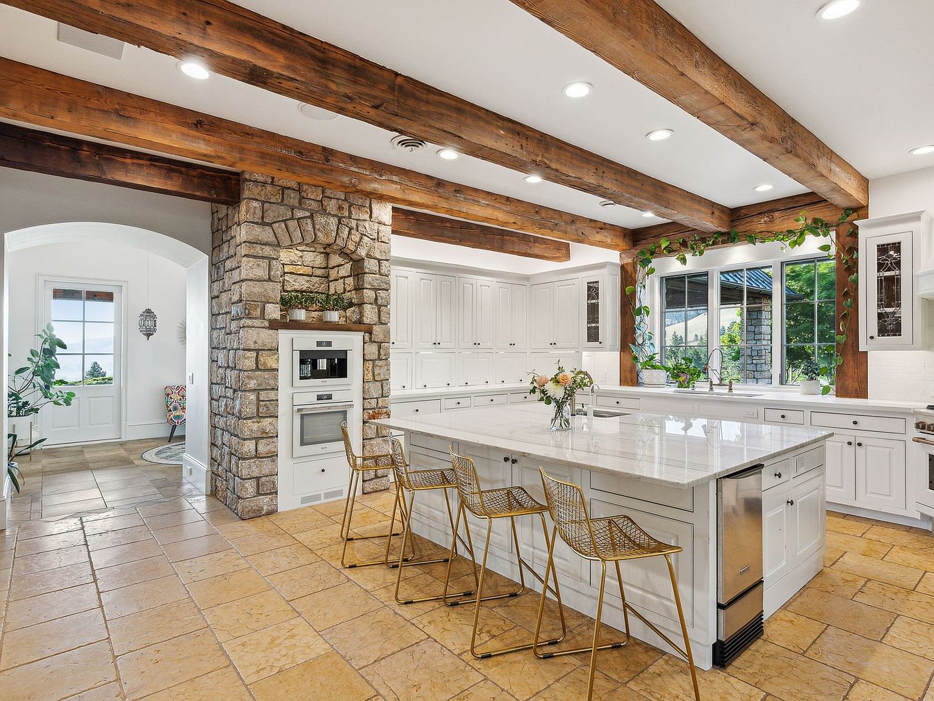 Spacious kitchen with a large marble-topped island perfect for family gatherings and casual meals, surrounded by stylish gold barstools. Exposed wooden beams and a beautiful stone archway add rustic charm, while expansive white cabinetry and a tiled floor create a bright and inviting atmosphere. Large windows provide plenty of natural light and offer scenic outdoor views, complemented by indoor greenery for a fresh touch. The open-concept layout invites a seamless flow into adjacent living spaces, making it ideal for entertaining. Family-friendly features include abundant storage, ample counter space, and durable finishes suitable for both everyday life and special occasions.